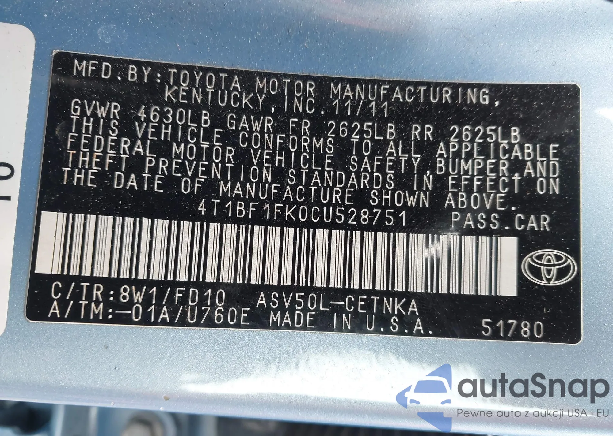 • VIN 4T1BF1FK0CU528751