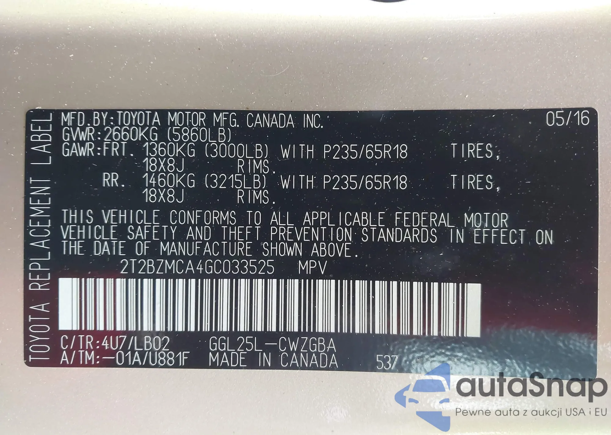 LOT: 43885896 VIN: 2T2BZMCA4GC033525