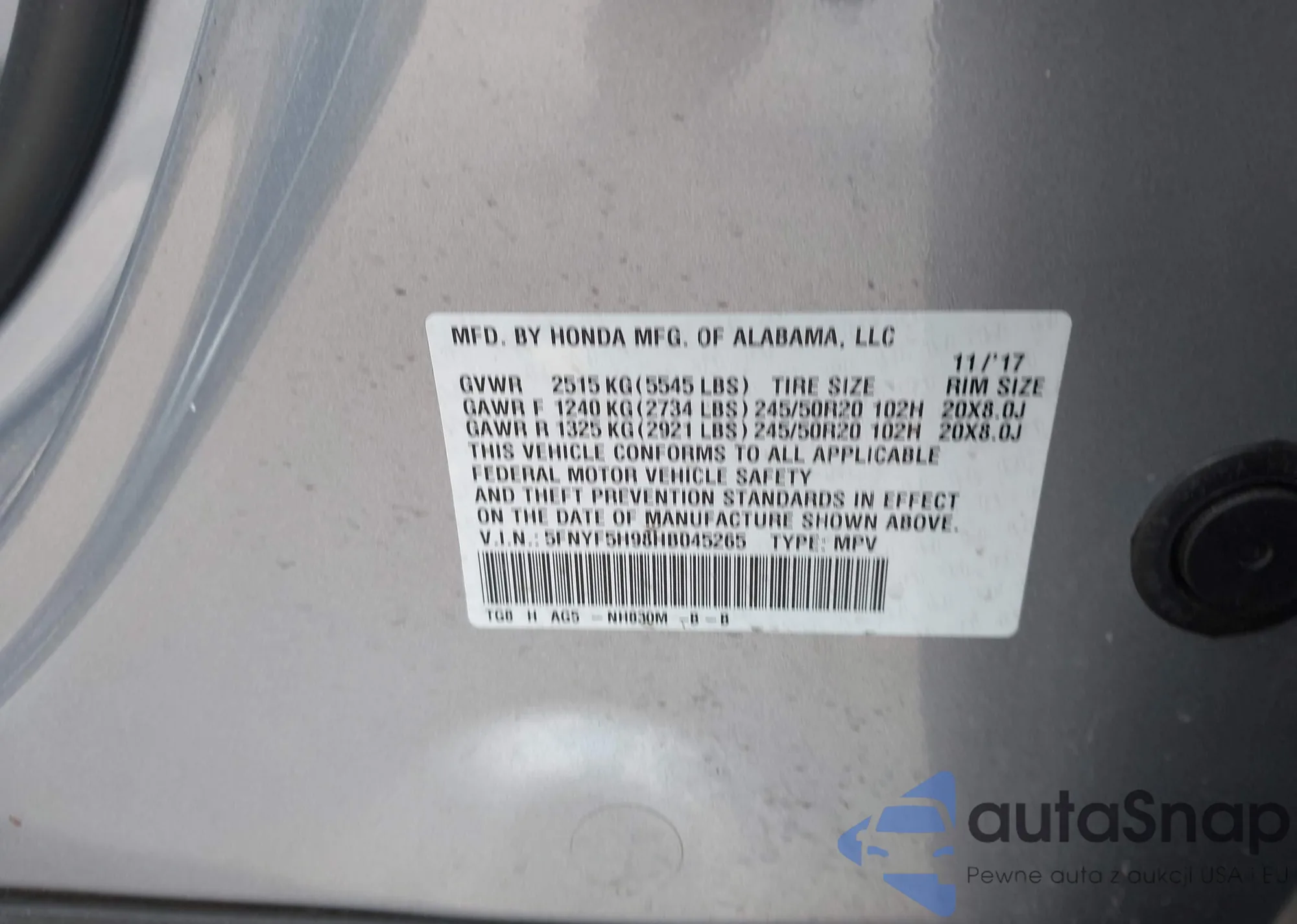 LOT: 43534098 VIN: 5FNYF5H98HB045265