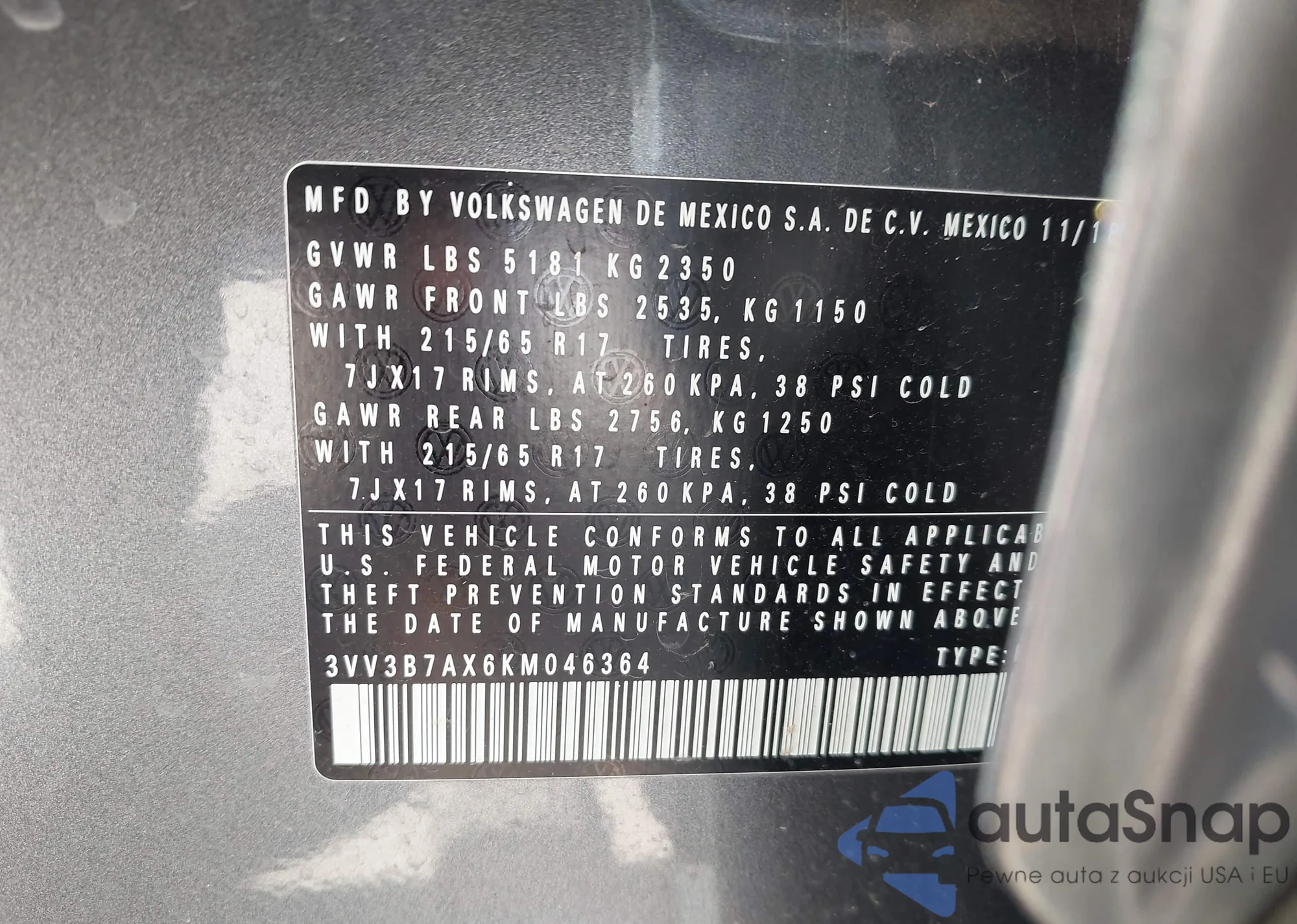 • VIN 3VV3B7AX6KM046364