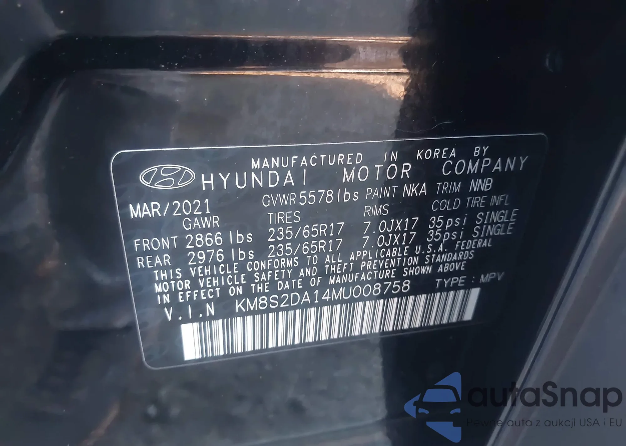• VIN 5NMSG3AB1AH385978