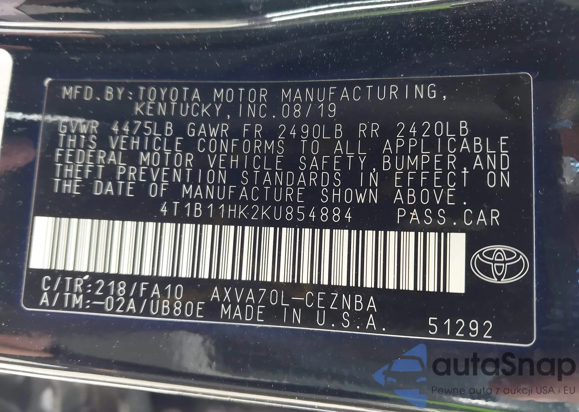 • VIN 4T1B11HK2KU854884