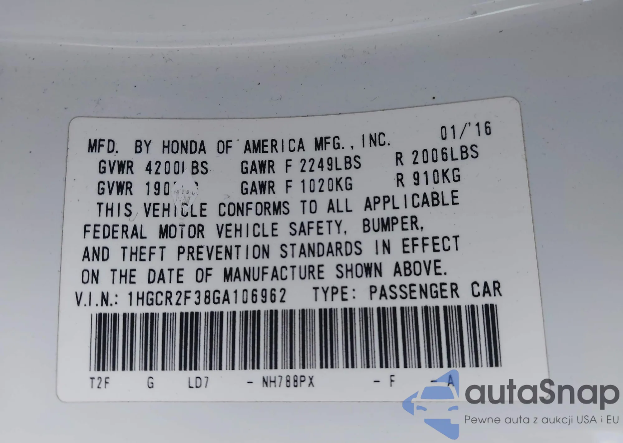 LOT: 43664479 VIN: 1HGCP2F33CA168897