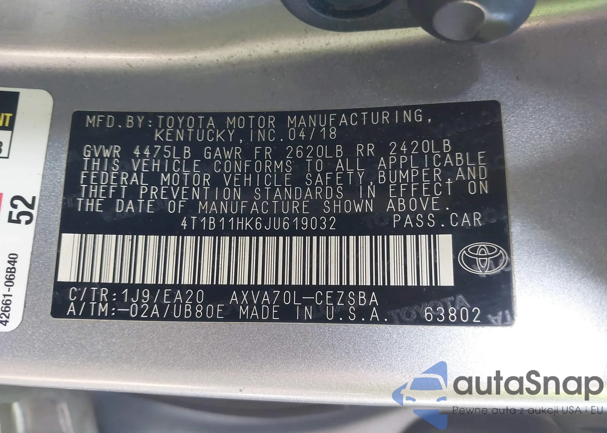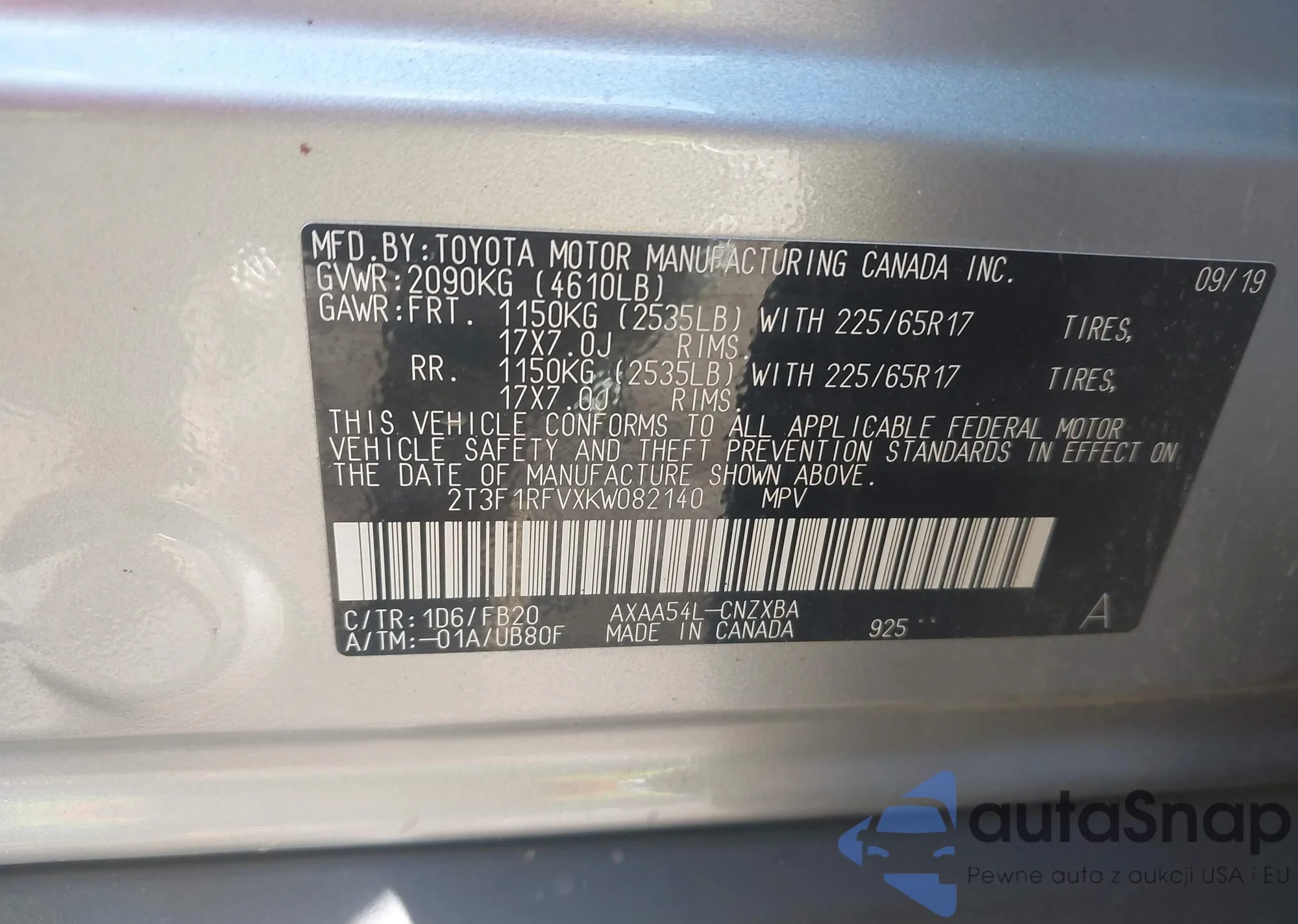 LOT: 43620200 VIN: 2T3F1RFVXKW082140