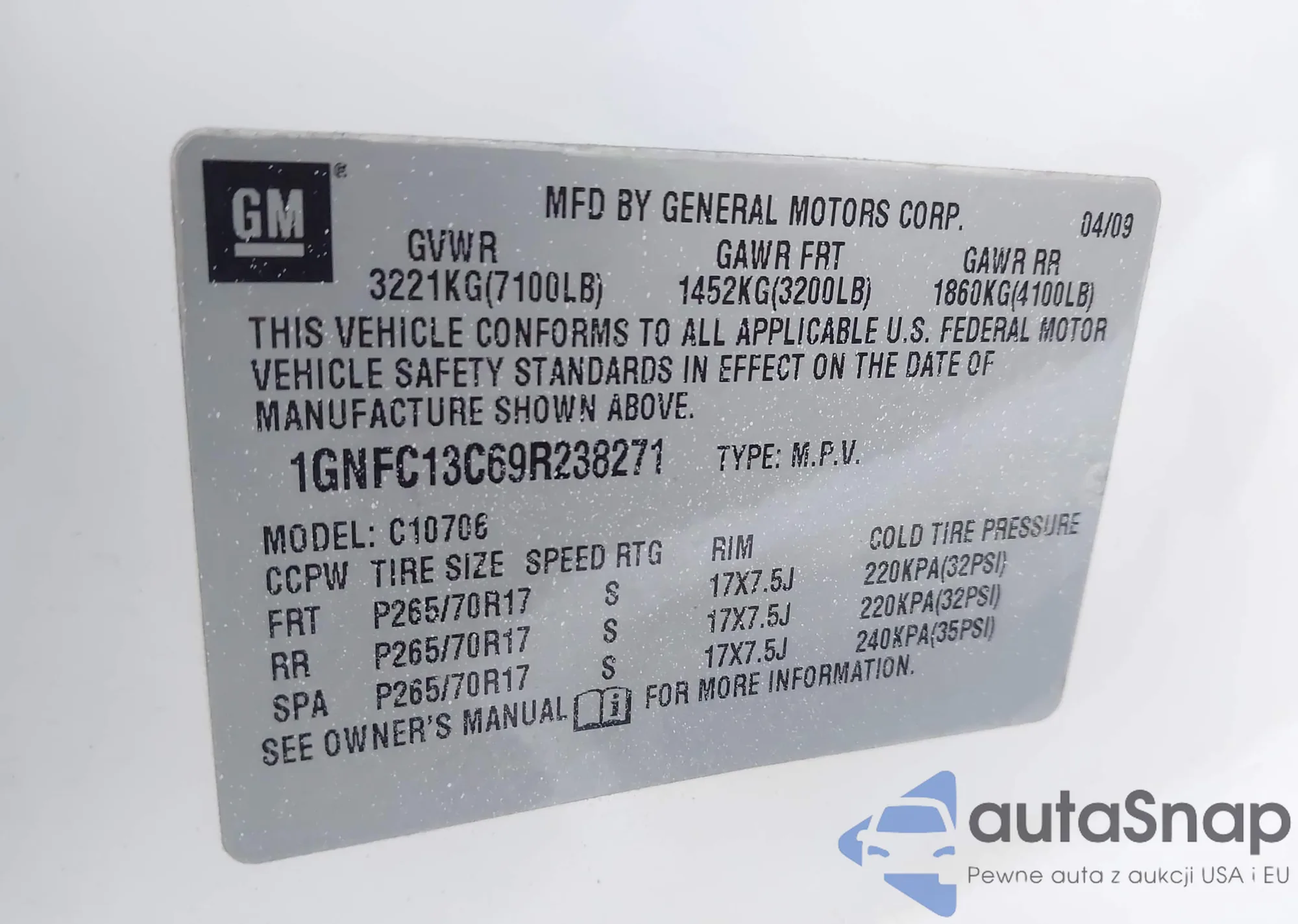 LOT: 43988788 VIN: 1GNFC13C69R238271