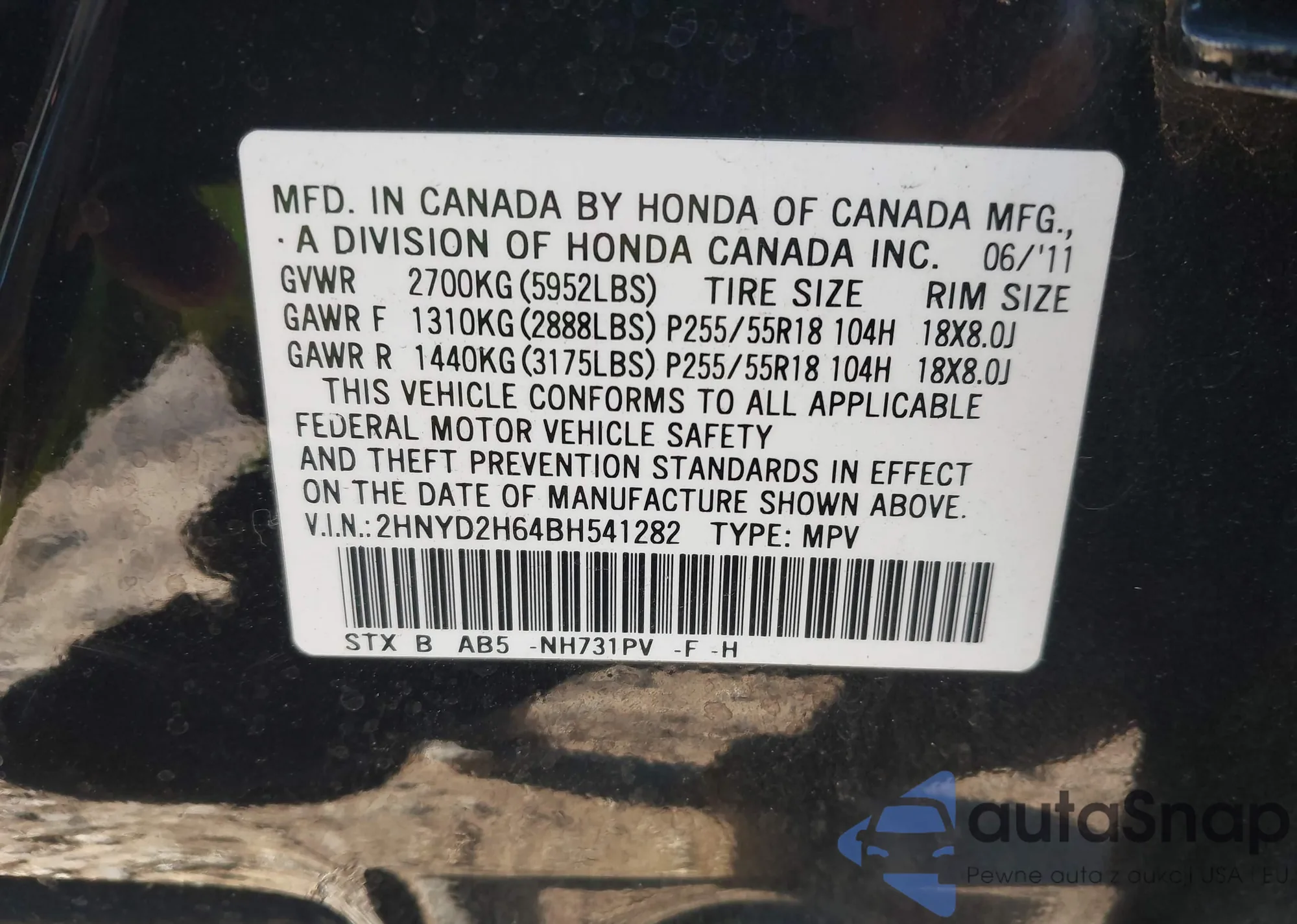 LOT: 43935616 VIN: 1HGCS1B75CA017898