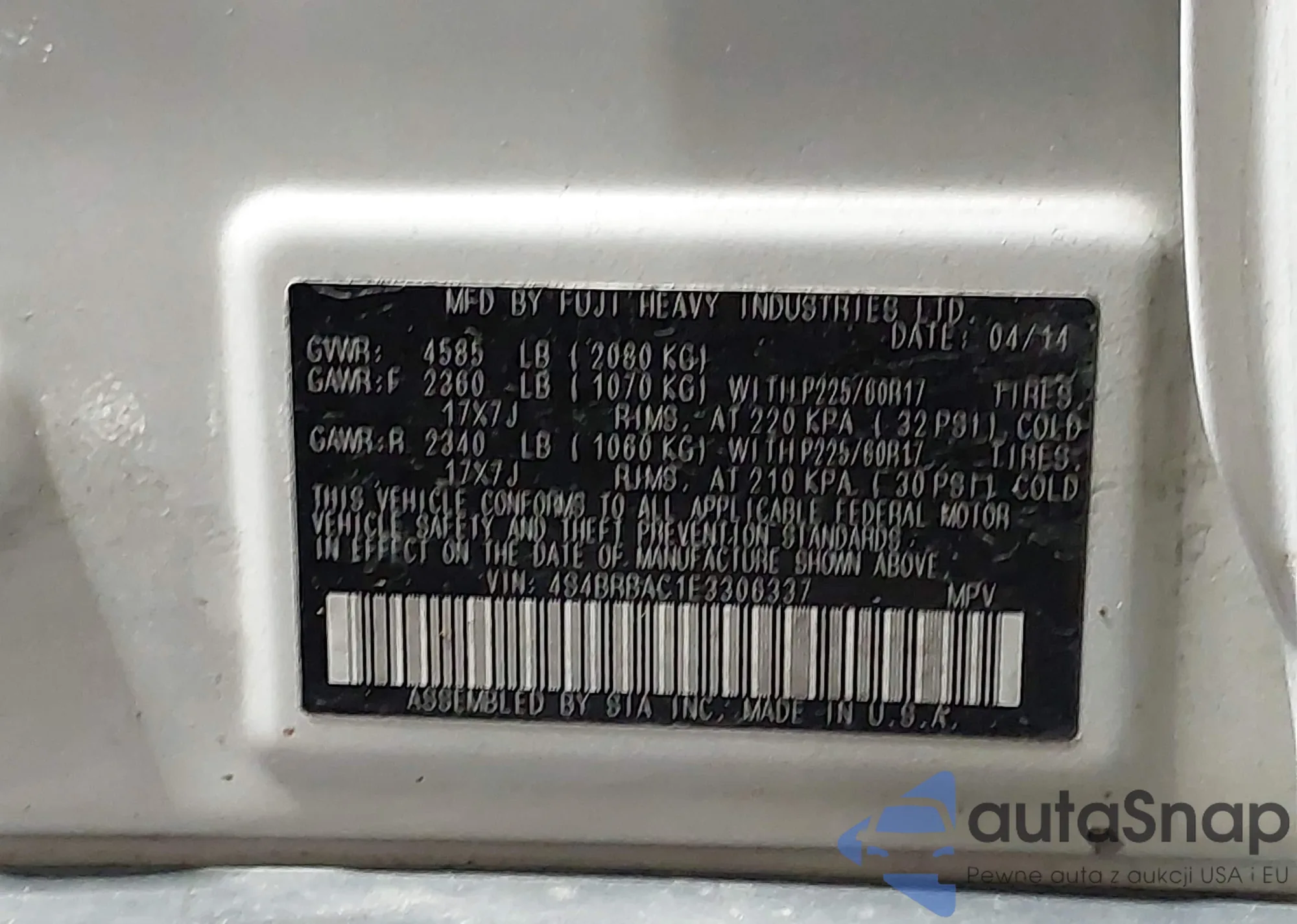 LOT: 43916886 VIN: 4S4BRBAC1E3306337