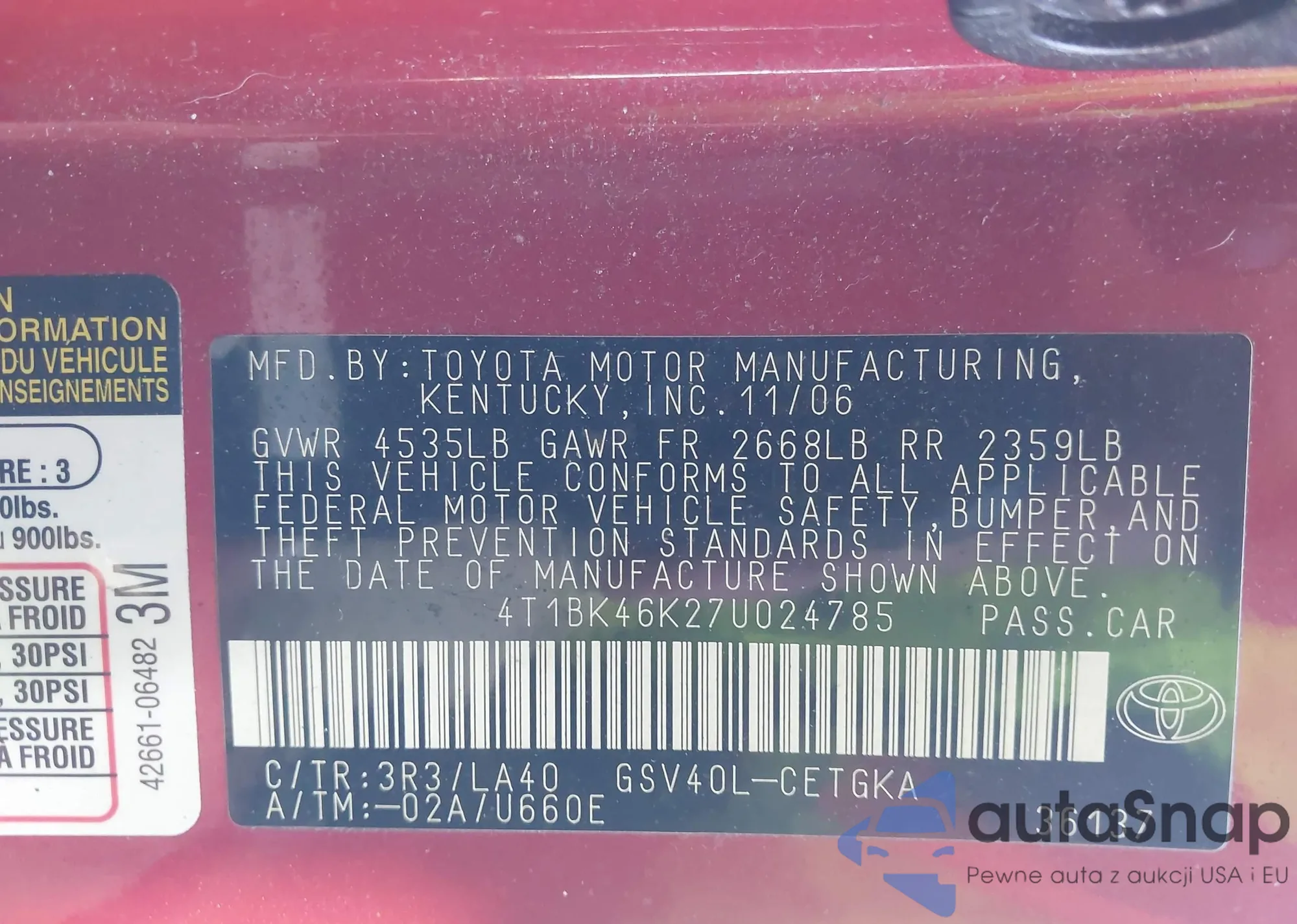 LOT: 43956633 VIN: 4T1BK46K27U024785