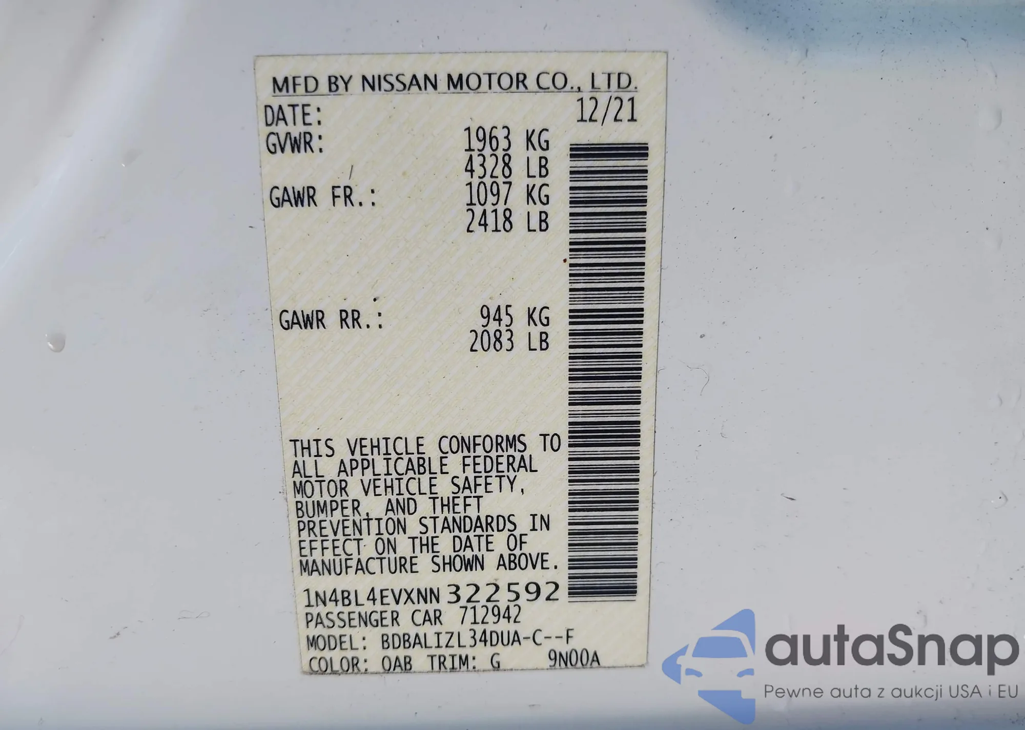 LOT: 43529326 VIN: 1N4BL4EVXNN322592