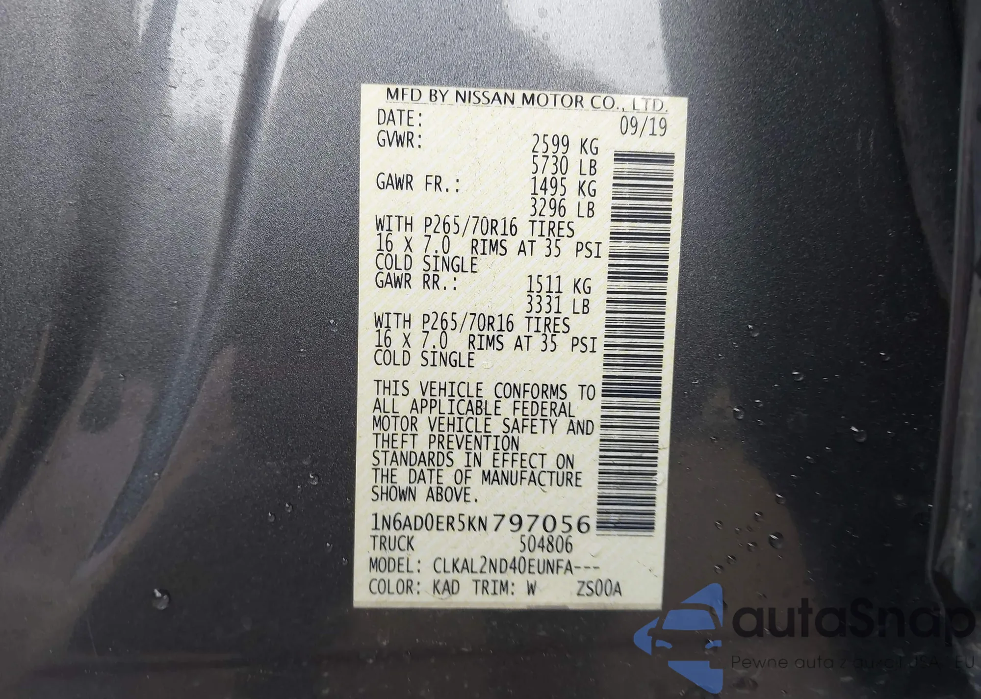 • VIN 1N6AD0ER5KN797056