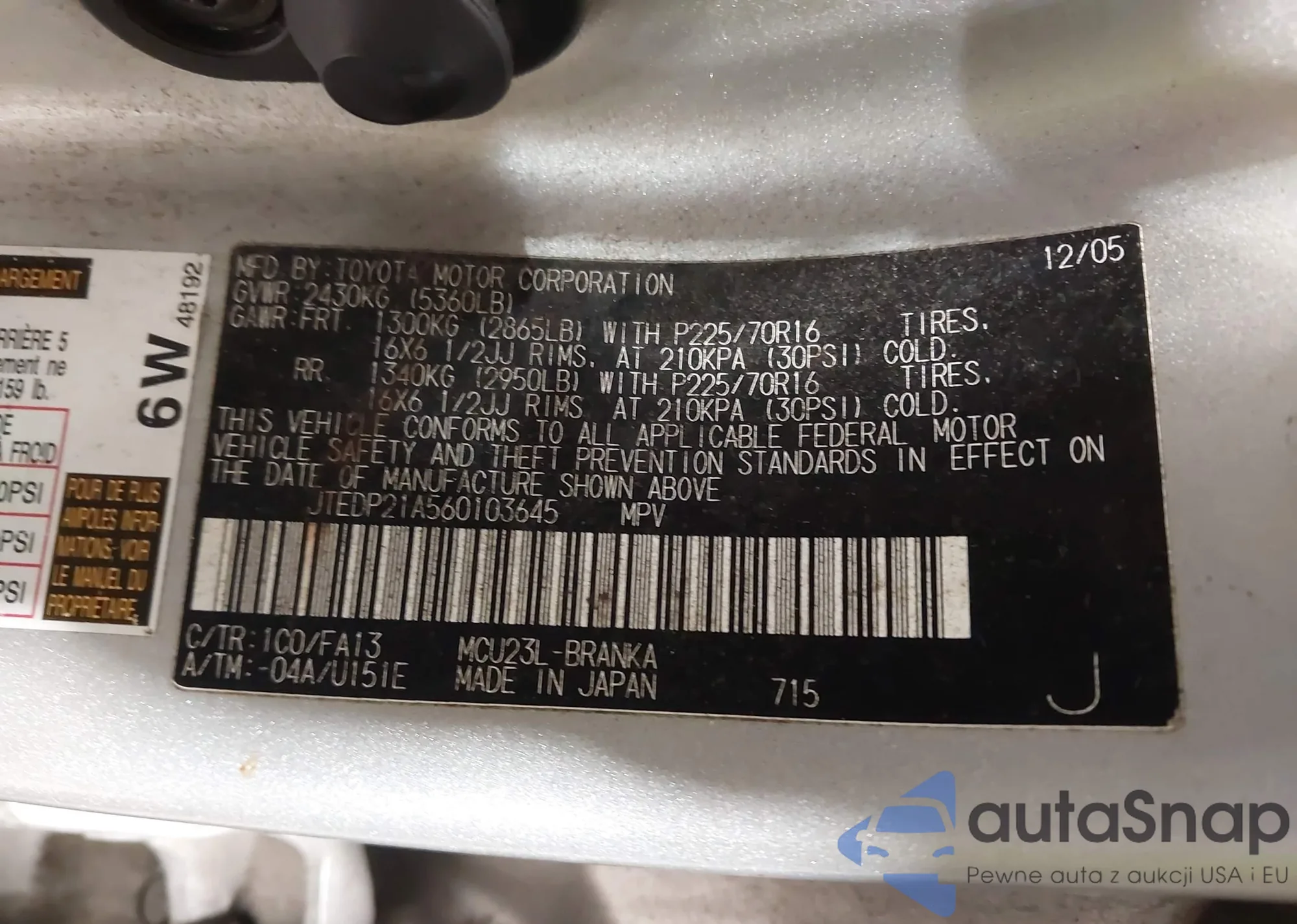 LOT: 43920928 VIN: JTEDP21A560103645