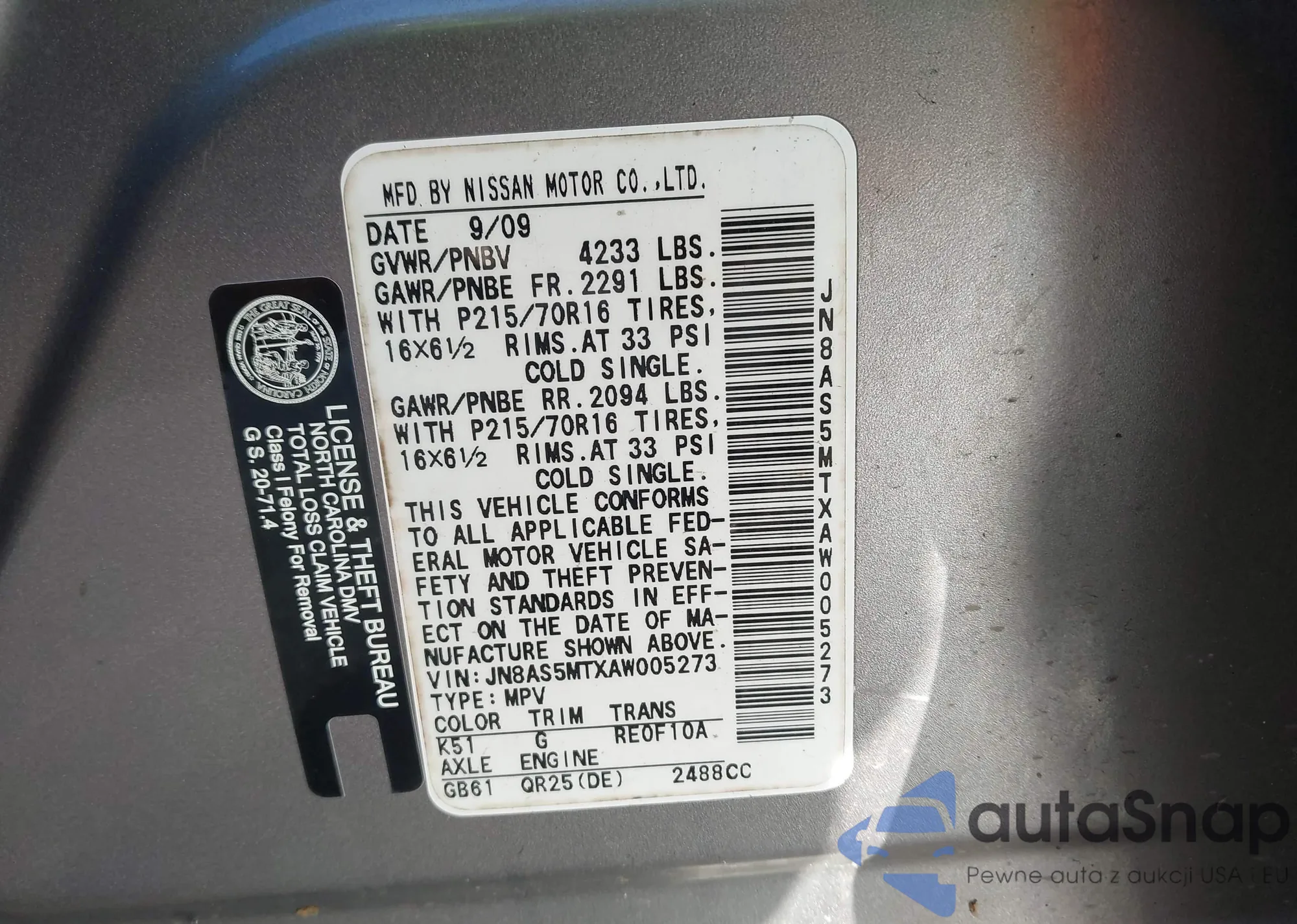 • VIN JN8AS5MTXAW005273