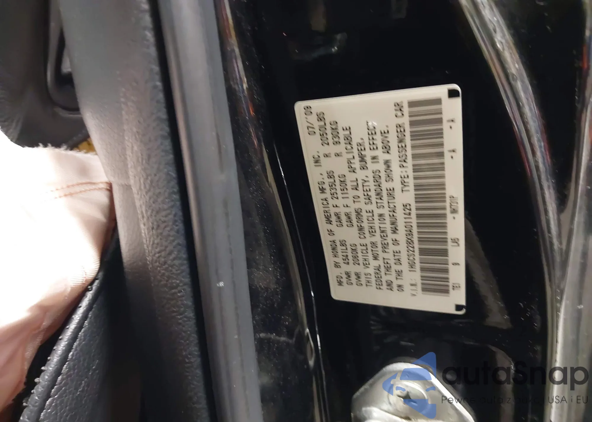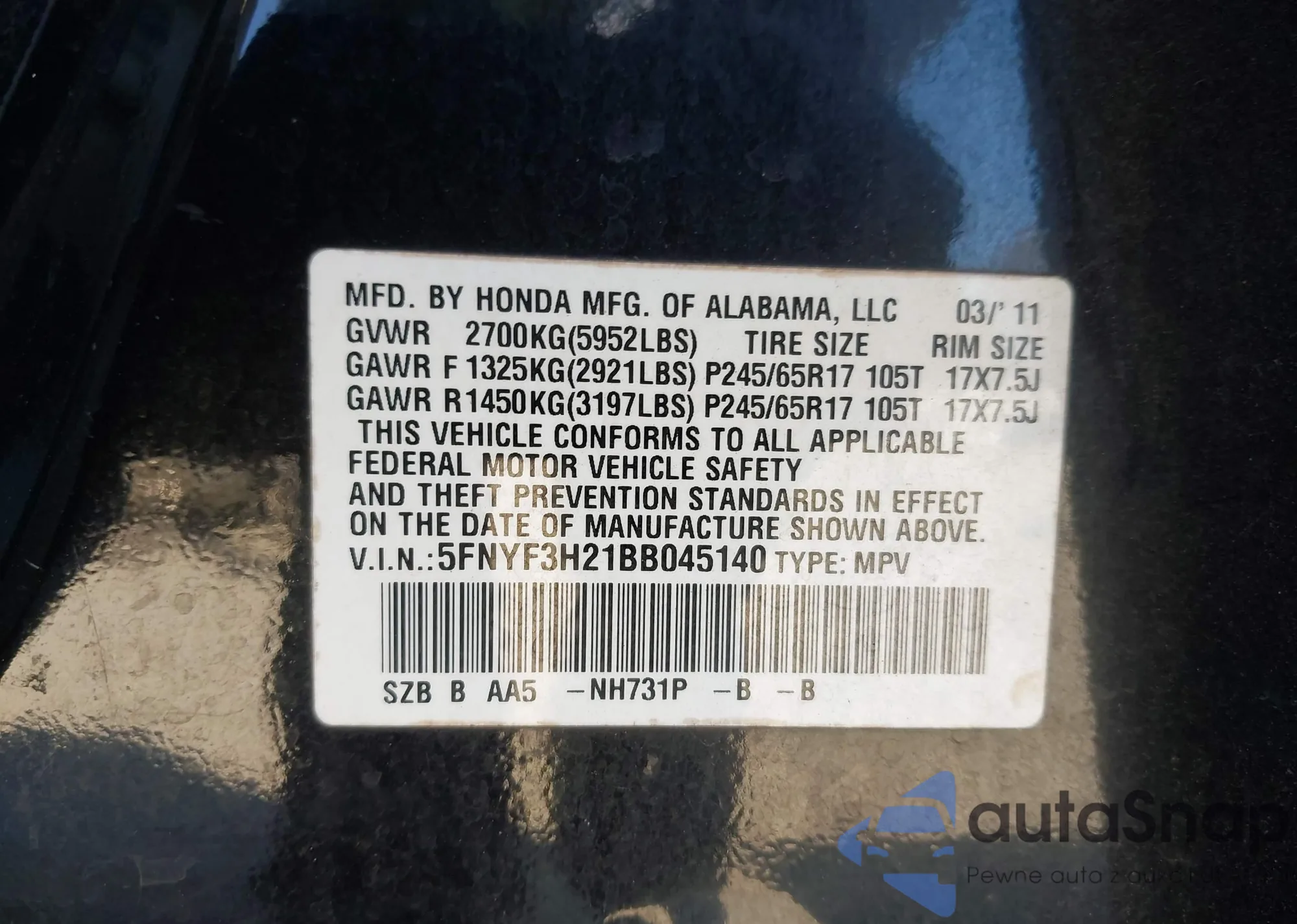 • VIN 5FNYF3H21BB045140