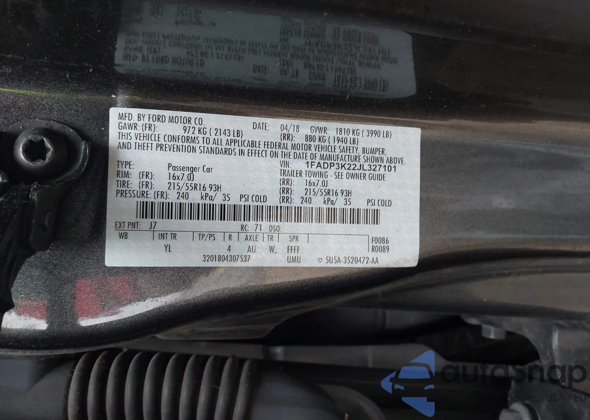 LOT: 43754317 VIN: 1FADP3K22JL327101