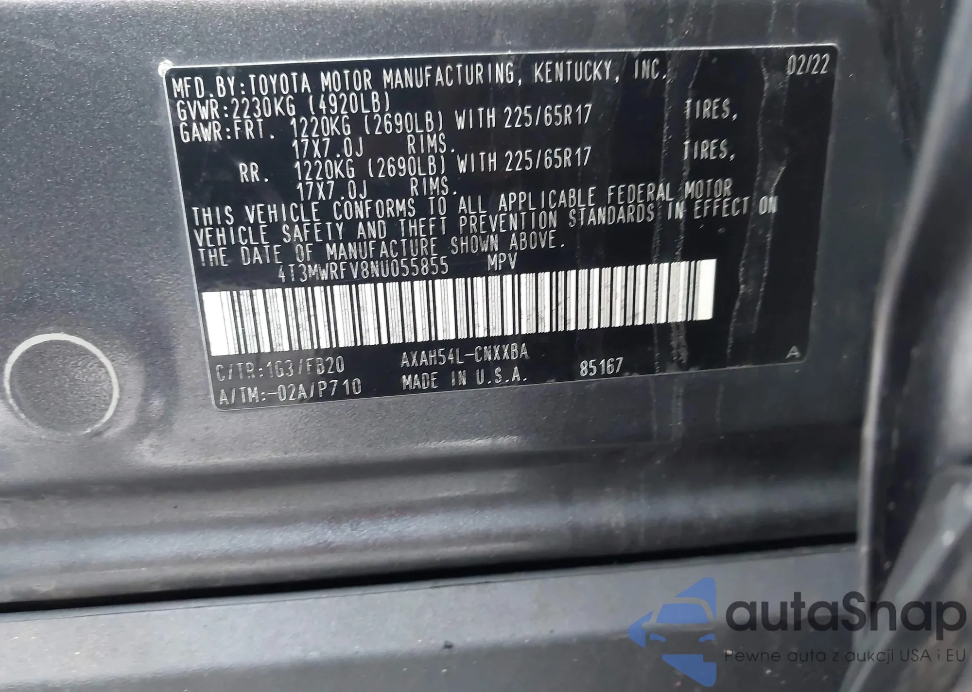 LOT: 43982466 VIN: 4T3MWRFV8NU055855