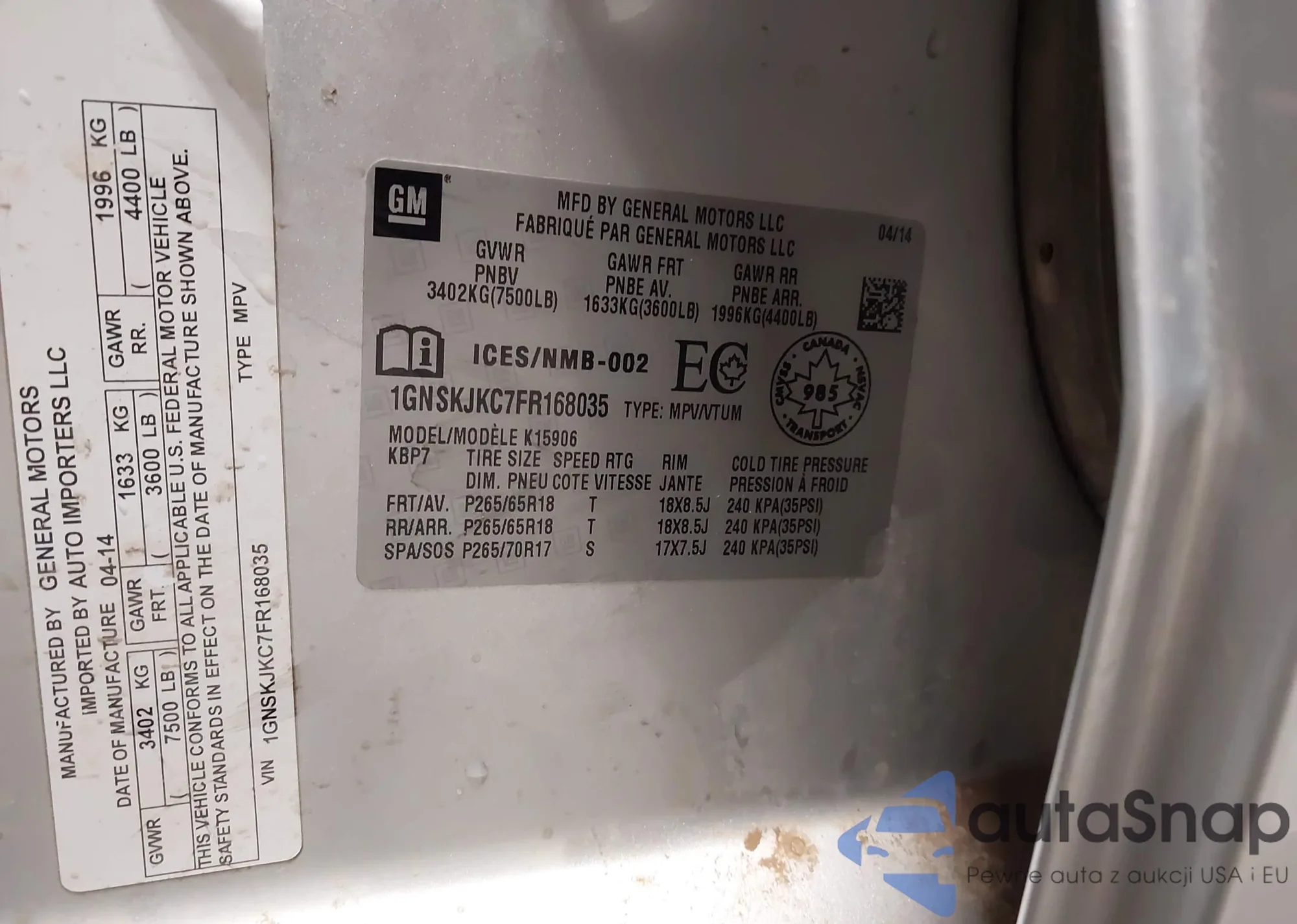 • VIN 1GNSKJKC7FR168035
