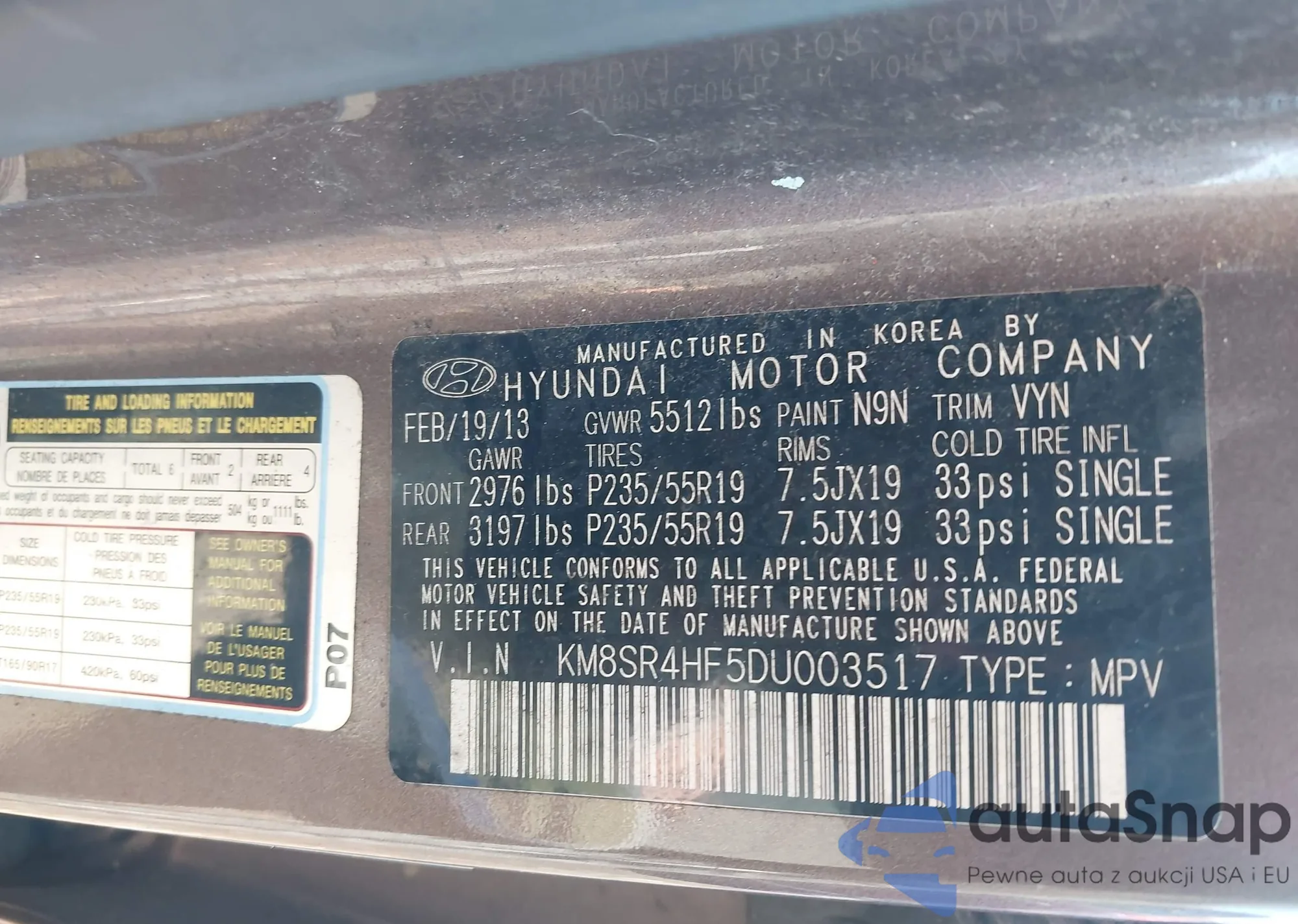 LOT: 43888373 VIN: KM8SR4HF5DU003517