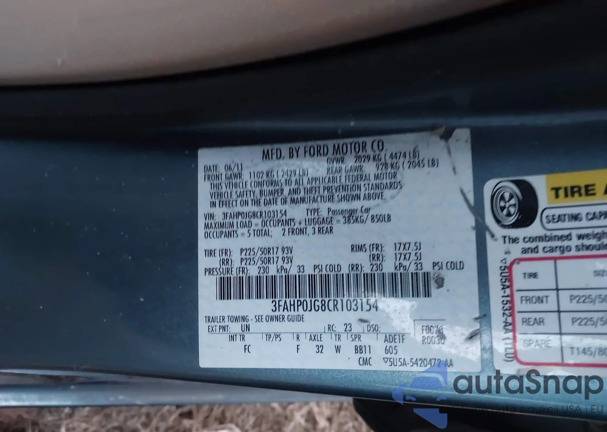 LOT: 43963403 VIN: 3FAHP0JG8CR103154
