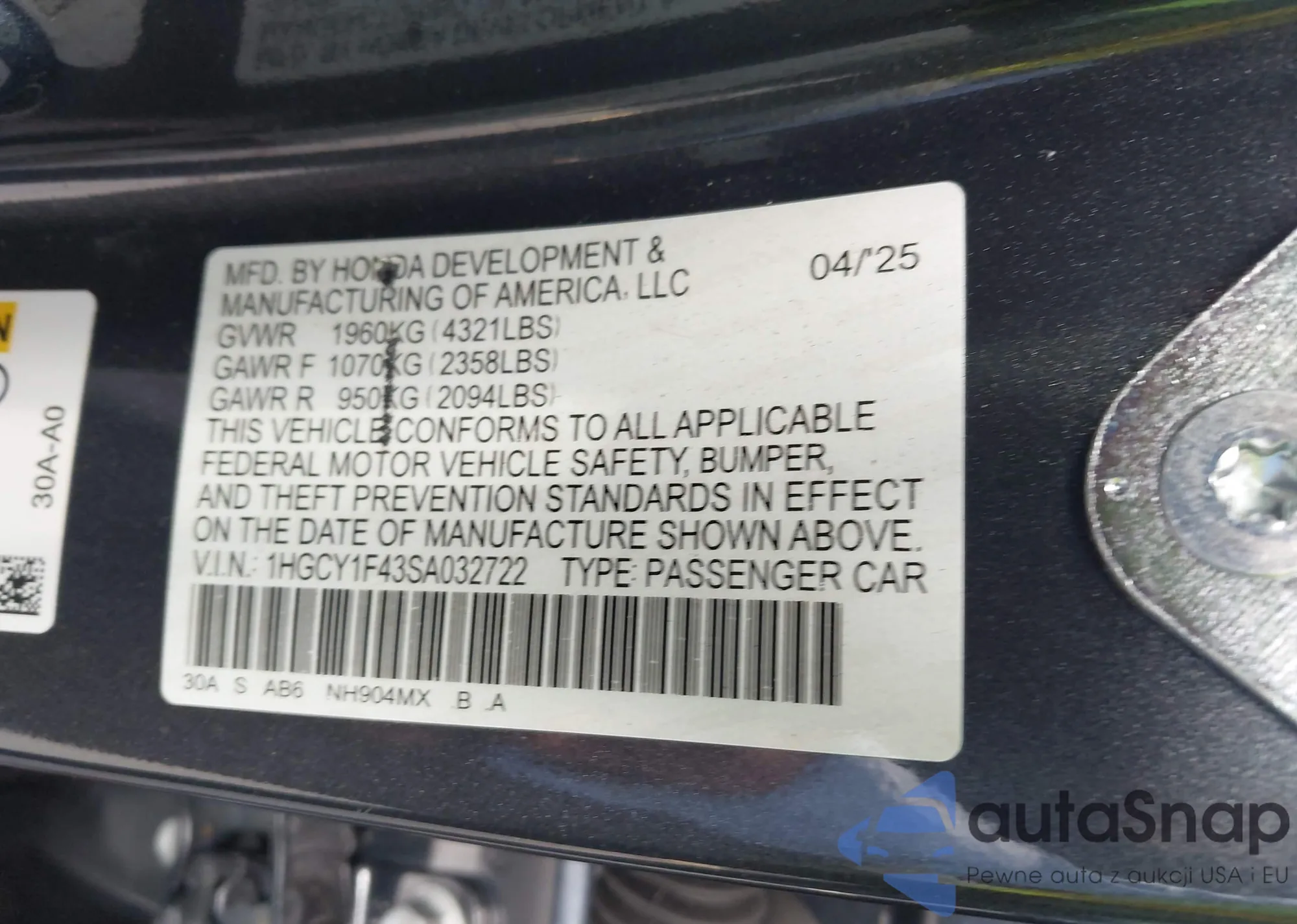 • VIN 1HGCY1F43SA032722
