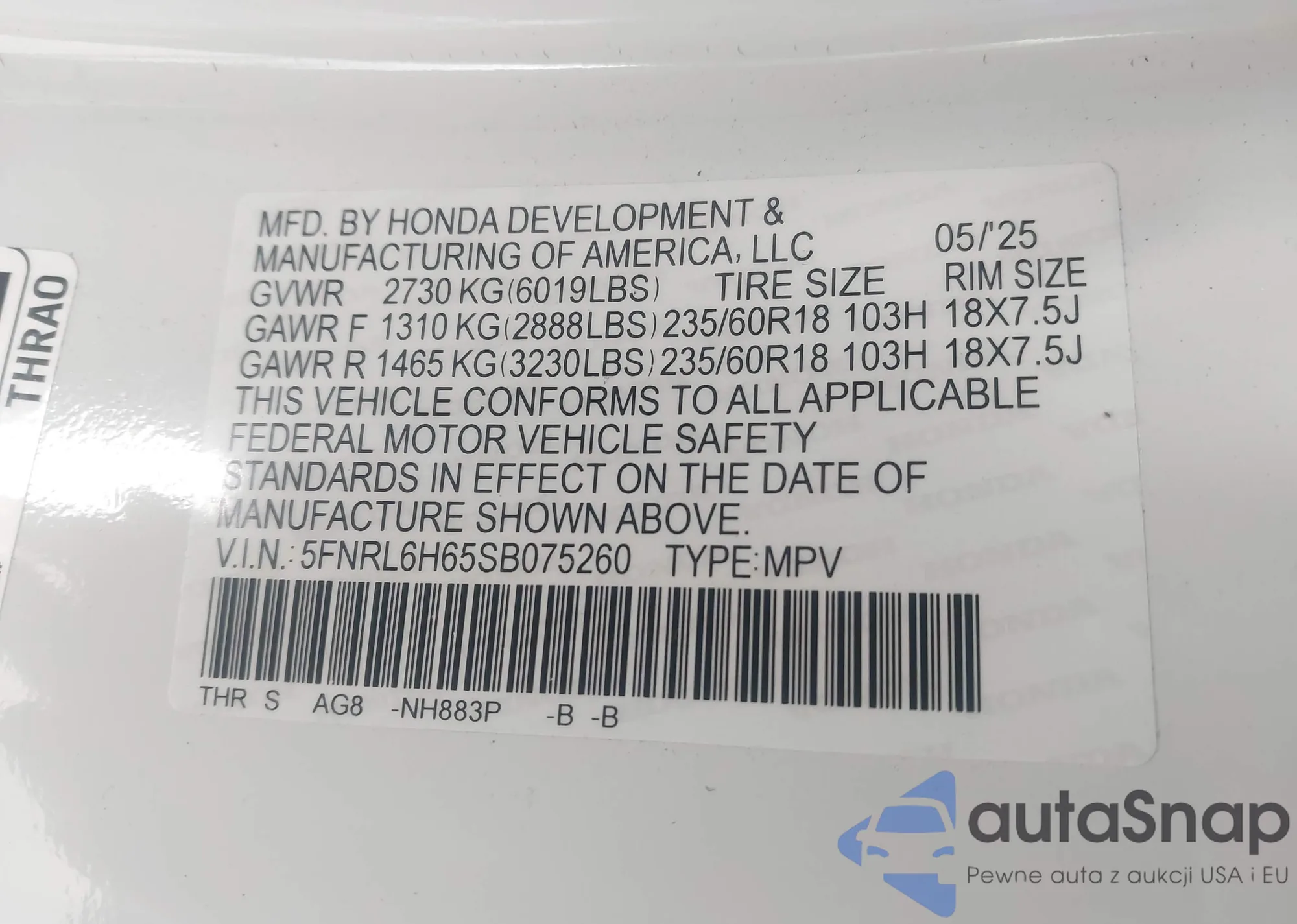 • VIN 5FNRL6H65SB075260