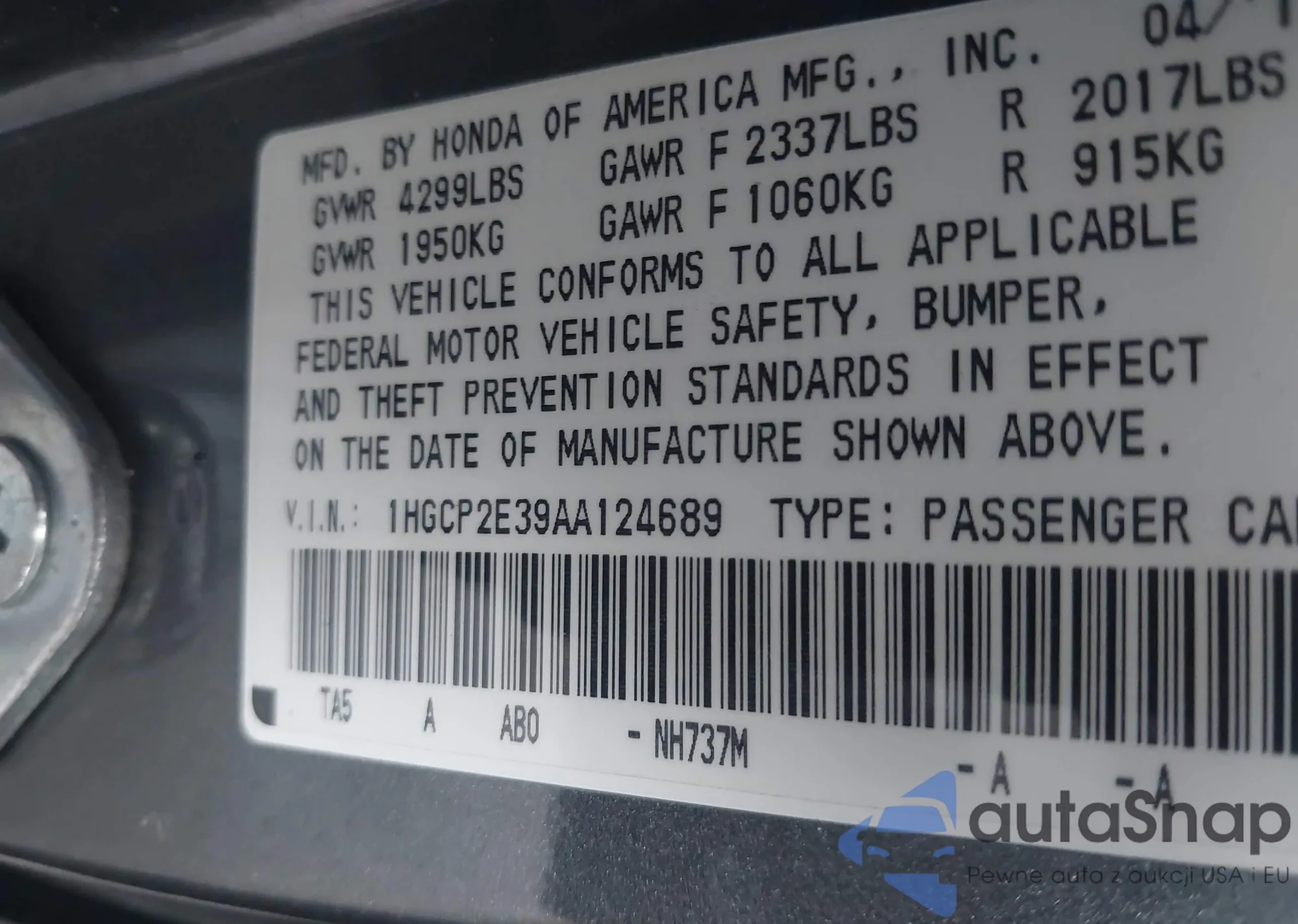 LOT: 43702255 VIN: 1HGCP2E39AA124689