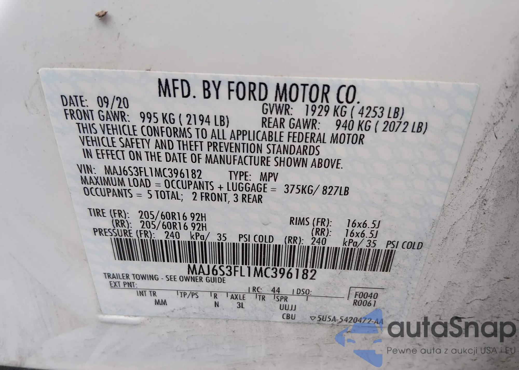 LOT: 43723514 VIN: MAJ6S3FL1MC396182