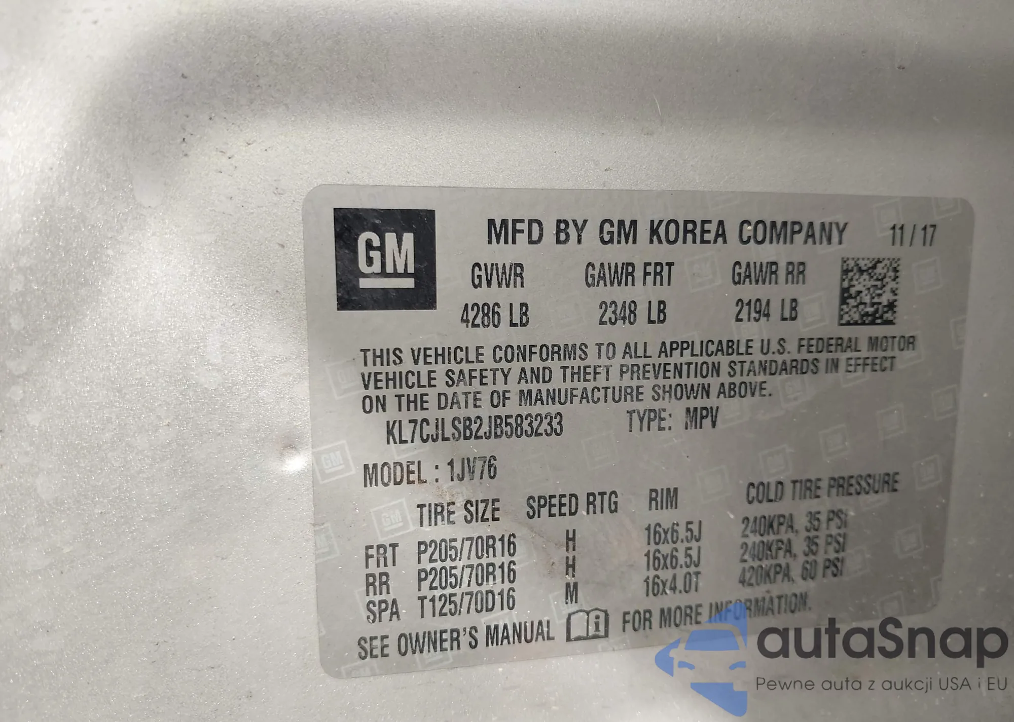 • VIN KL7CJLSB2JB583233