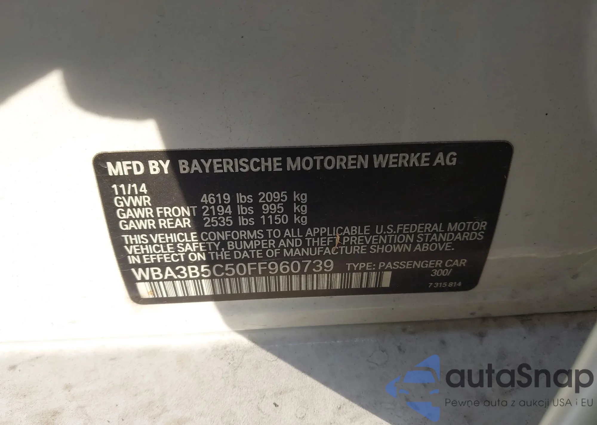 LOT: 43943334 VIN: WBA3B5C50FF960739