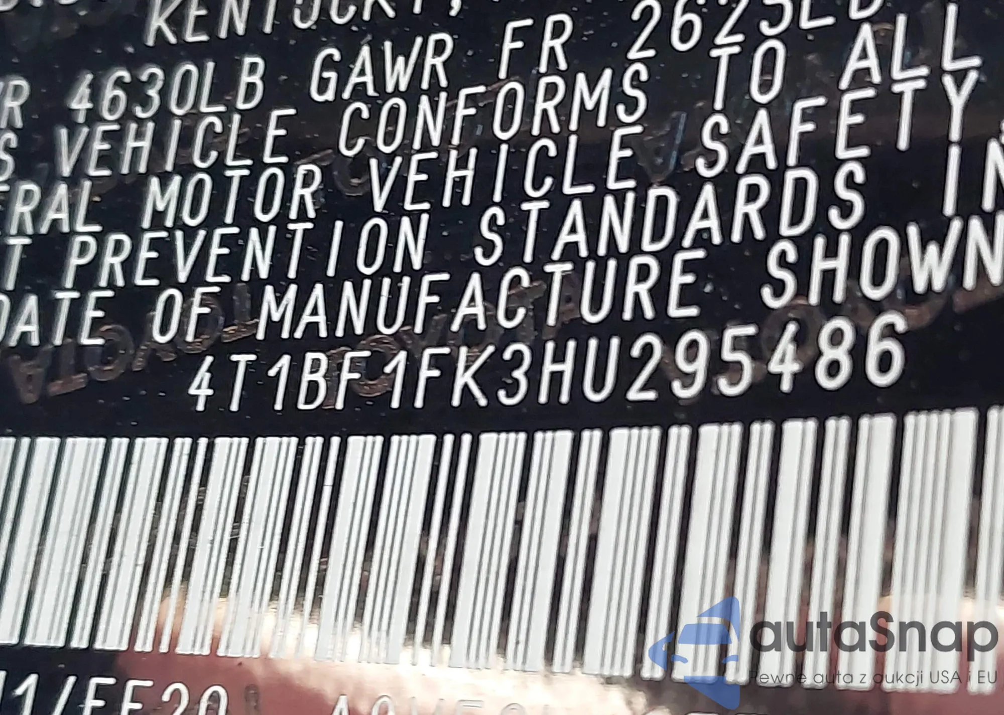 • VIN 4T1BF1FK3HU295486
