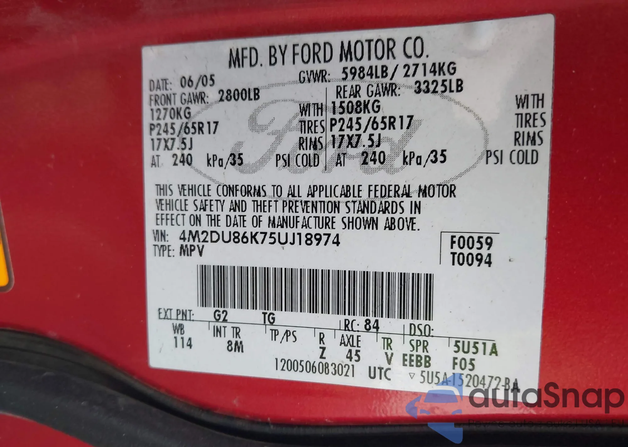 • VIN 4M2DU86K75UJ18974