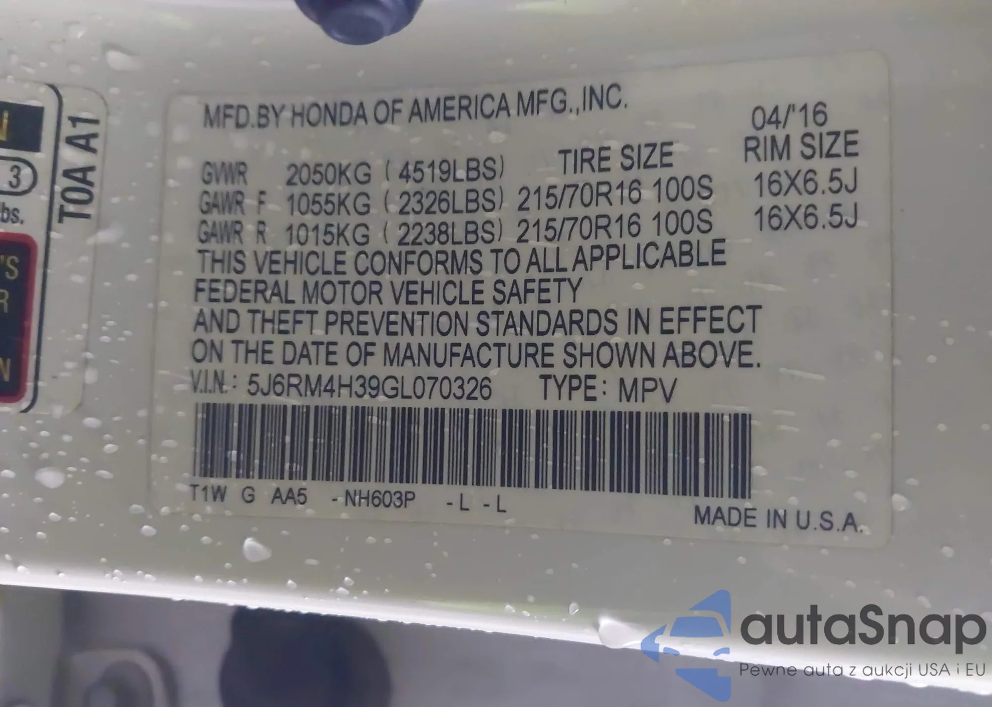 • VIN 5J6RM4H39GL070326