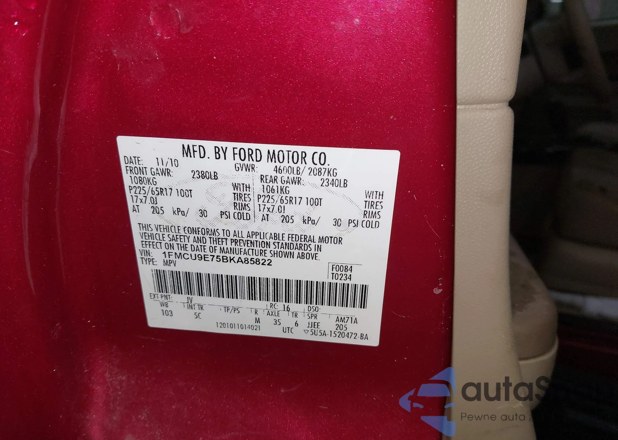 • VIN 1FMCU9E75BKA85822