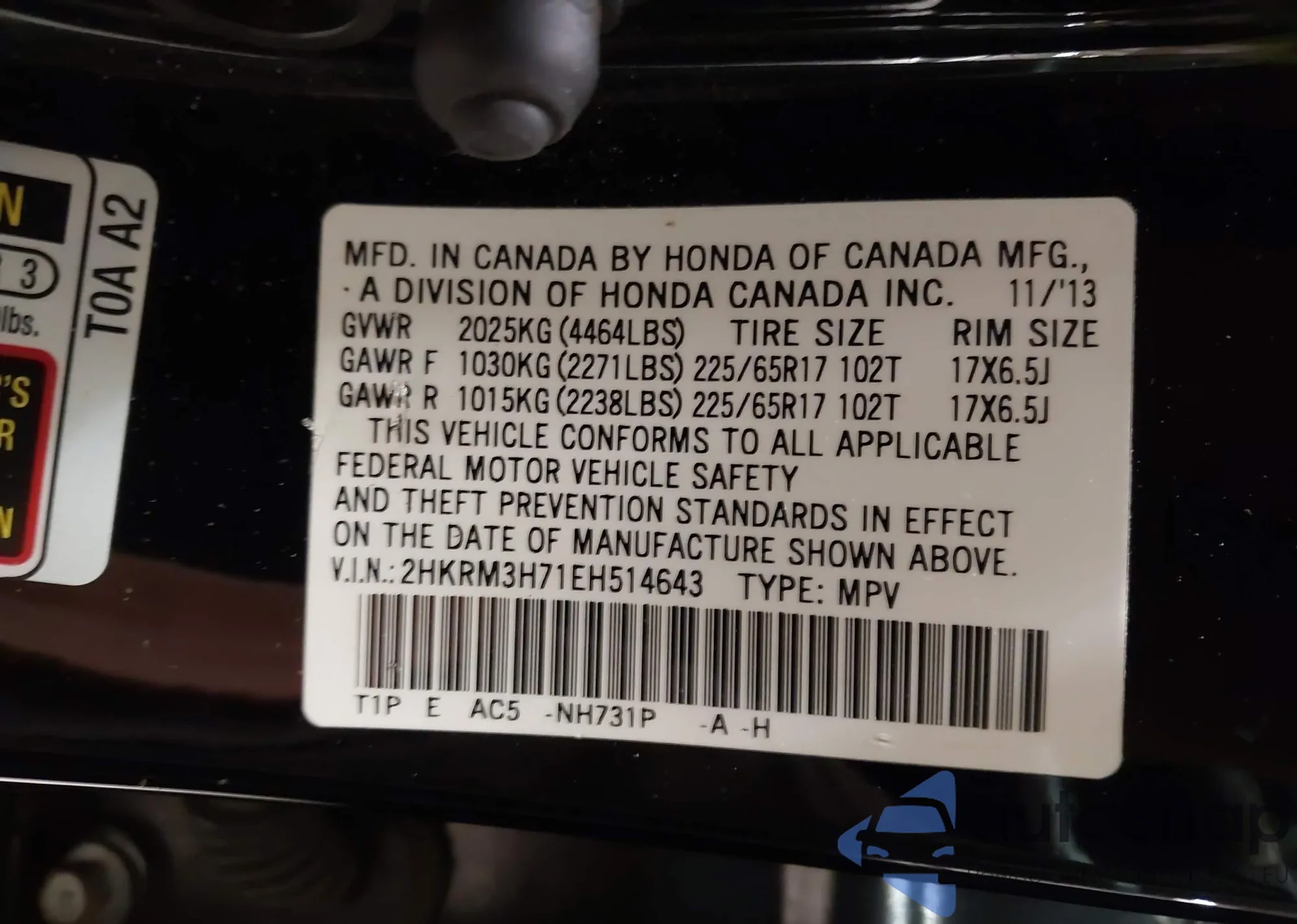 LOT: 43689167 VIN: 2HKRM3H71EH514643