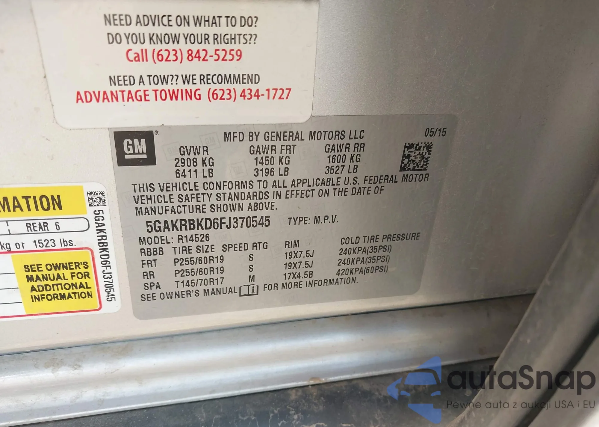LOT: 43330477 VIN: 5GAKRBKD6FJ370545