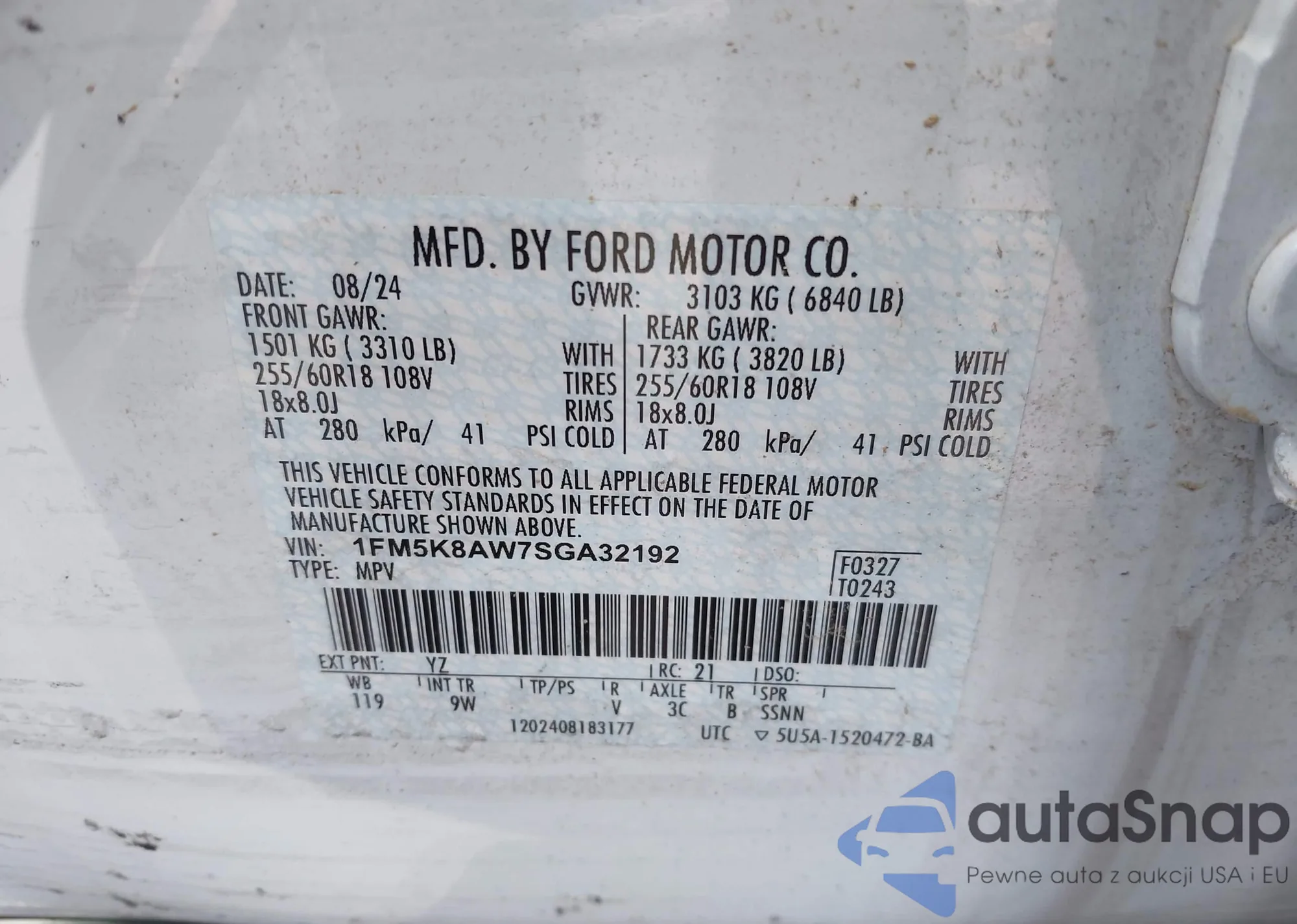 LOT: 43902193 VIN: 1FM5K8AW7SGA32192