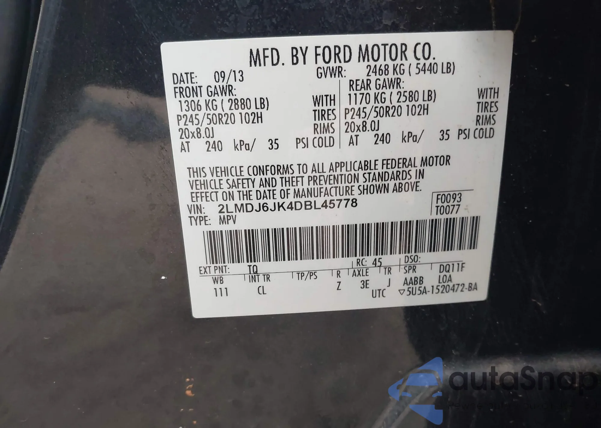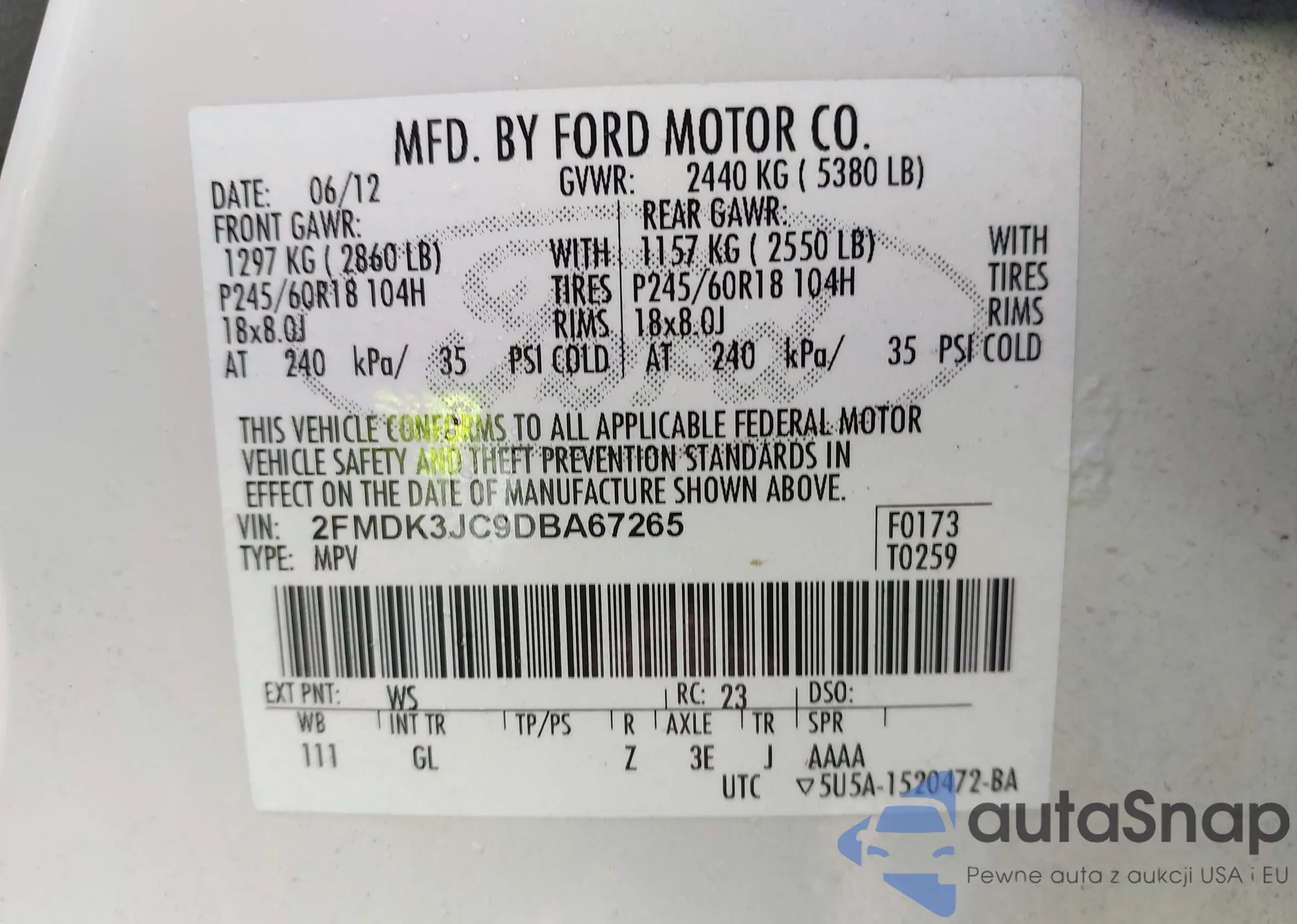 LOT: 43782382 VIN: 2FMDK3JC9DBA67265