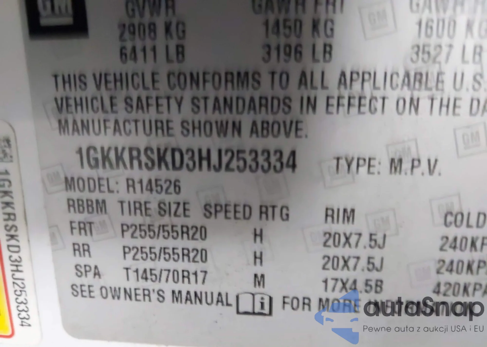 LOT: 43732721 VIN: 1GKKRSKD3HJ253334