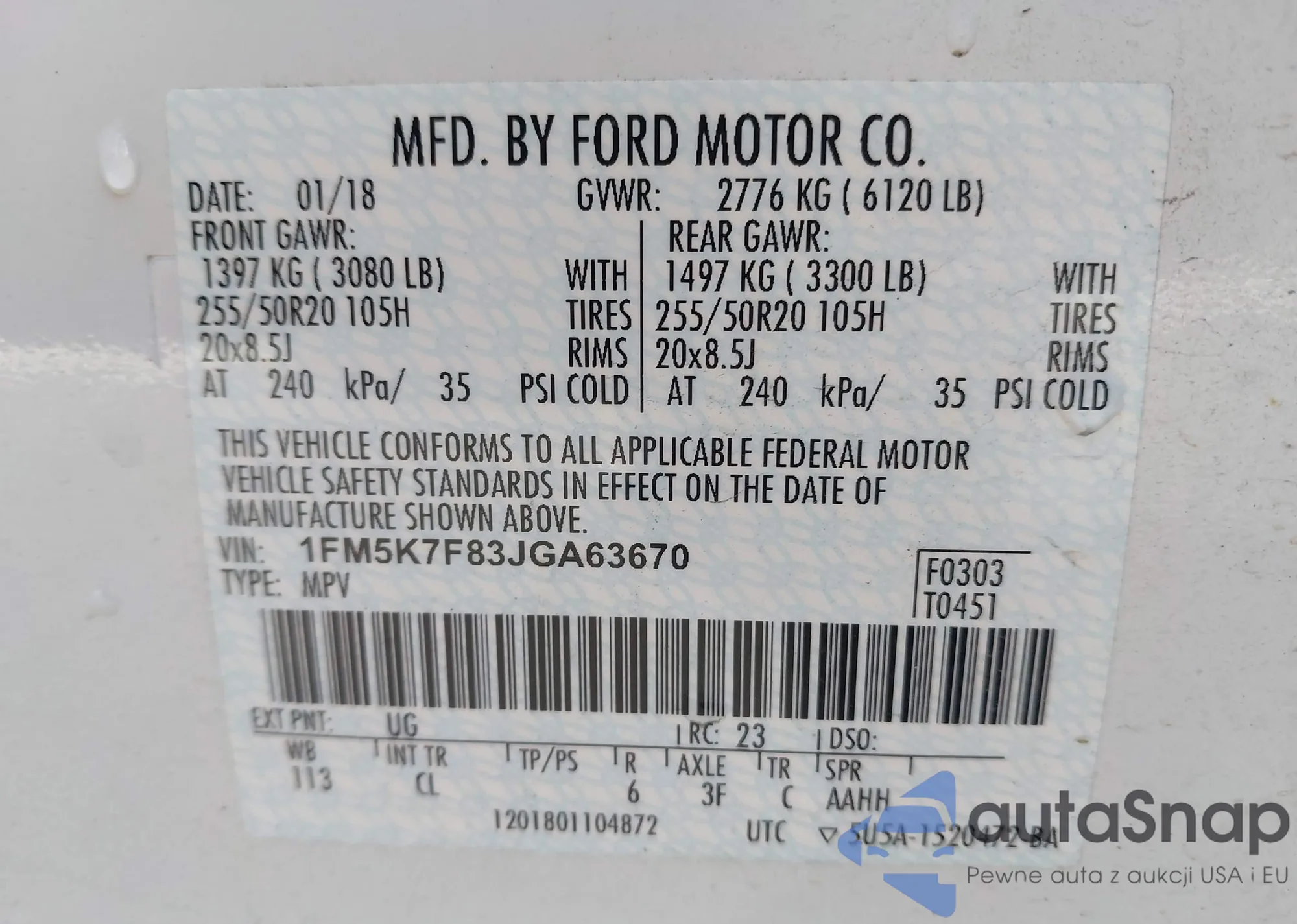 LOT: 43571374 VIN: 1FM5K7F83JGA63670