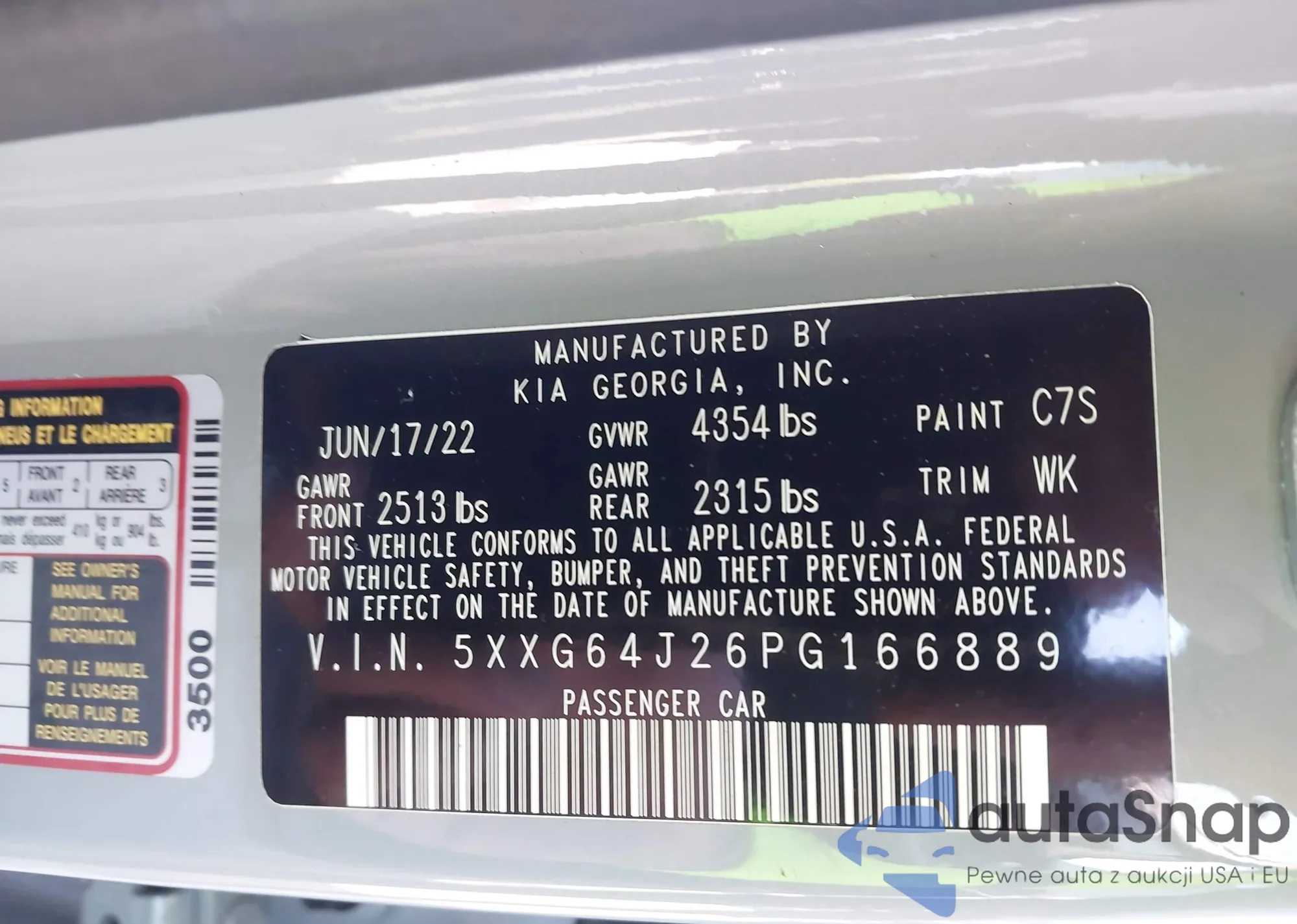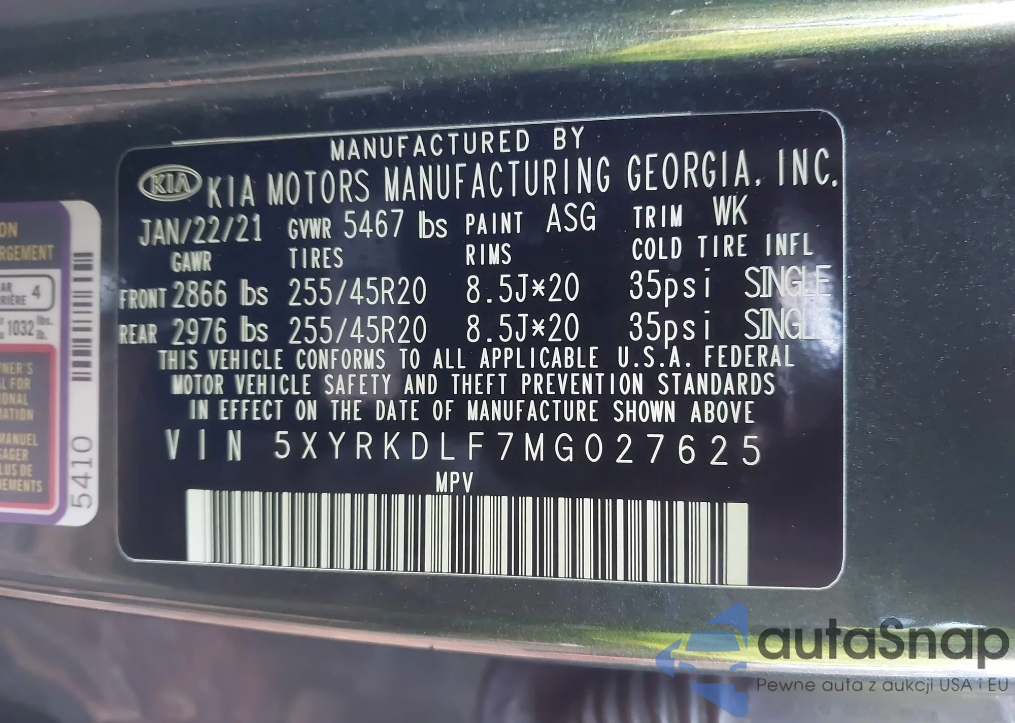 LOT: 43766943 VIN: 5XYRKDLF7MG027625