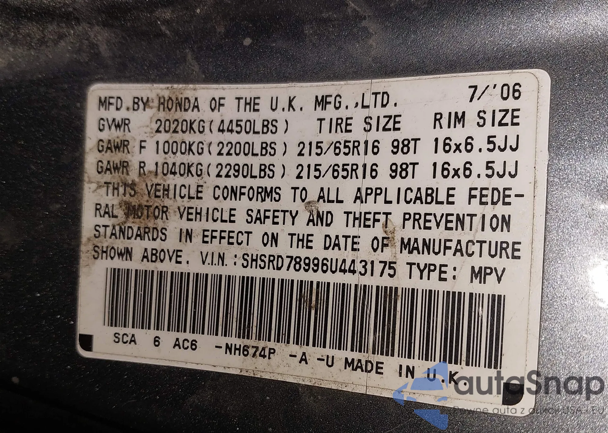 • VIN 5J6RE48788L030742