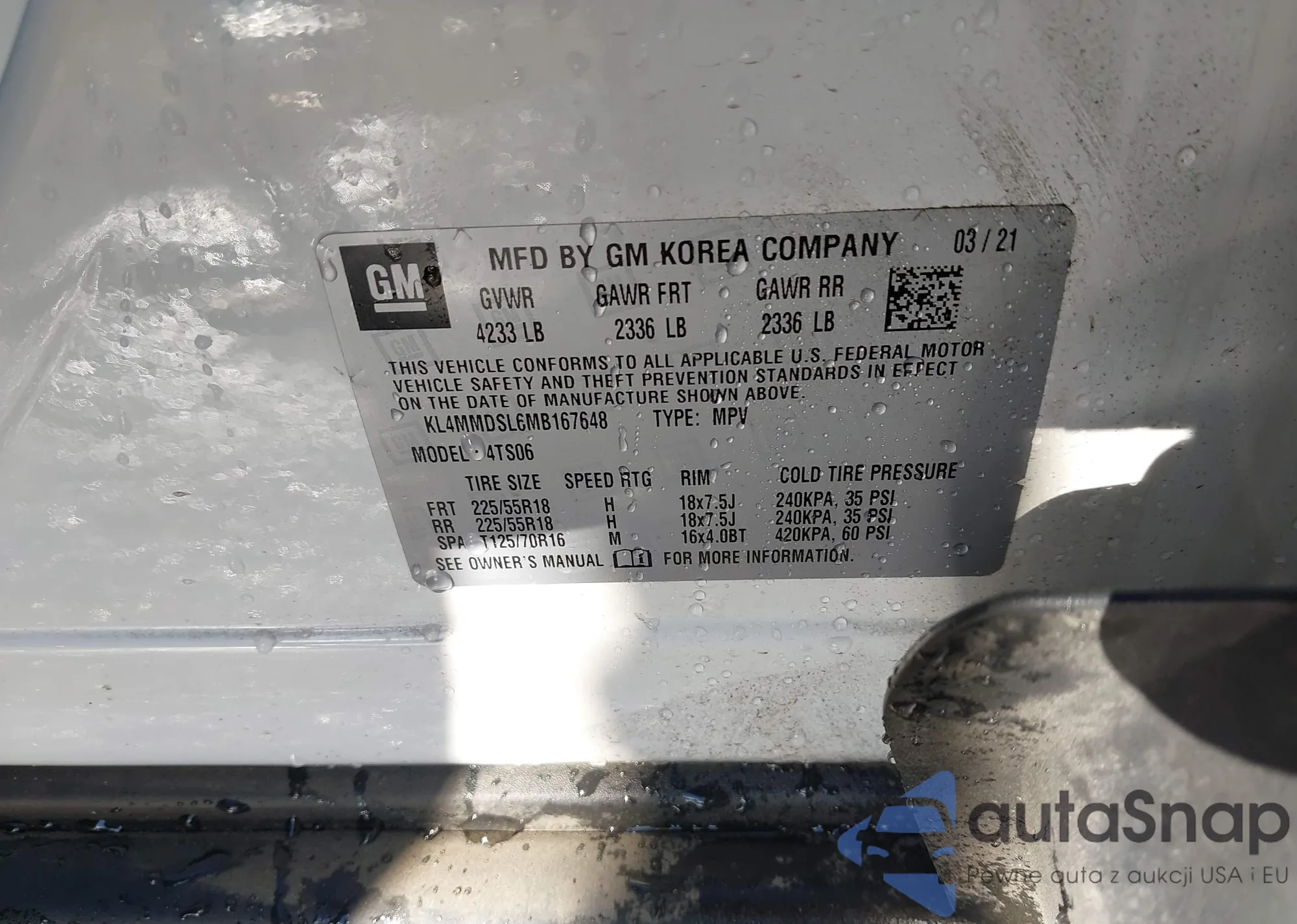 LOT: 43433863 VIN: KL4MMDSL6MB167648