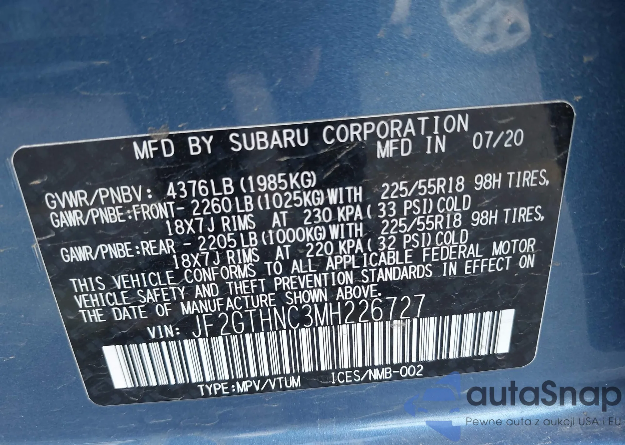 • VIN JF2GTHNC3MH226727