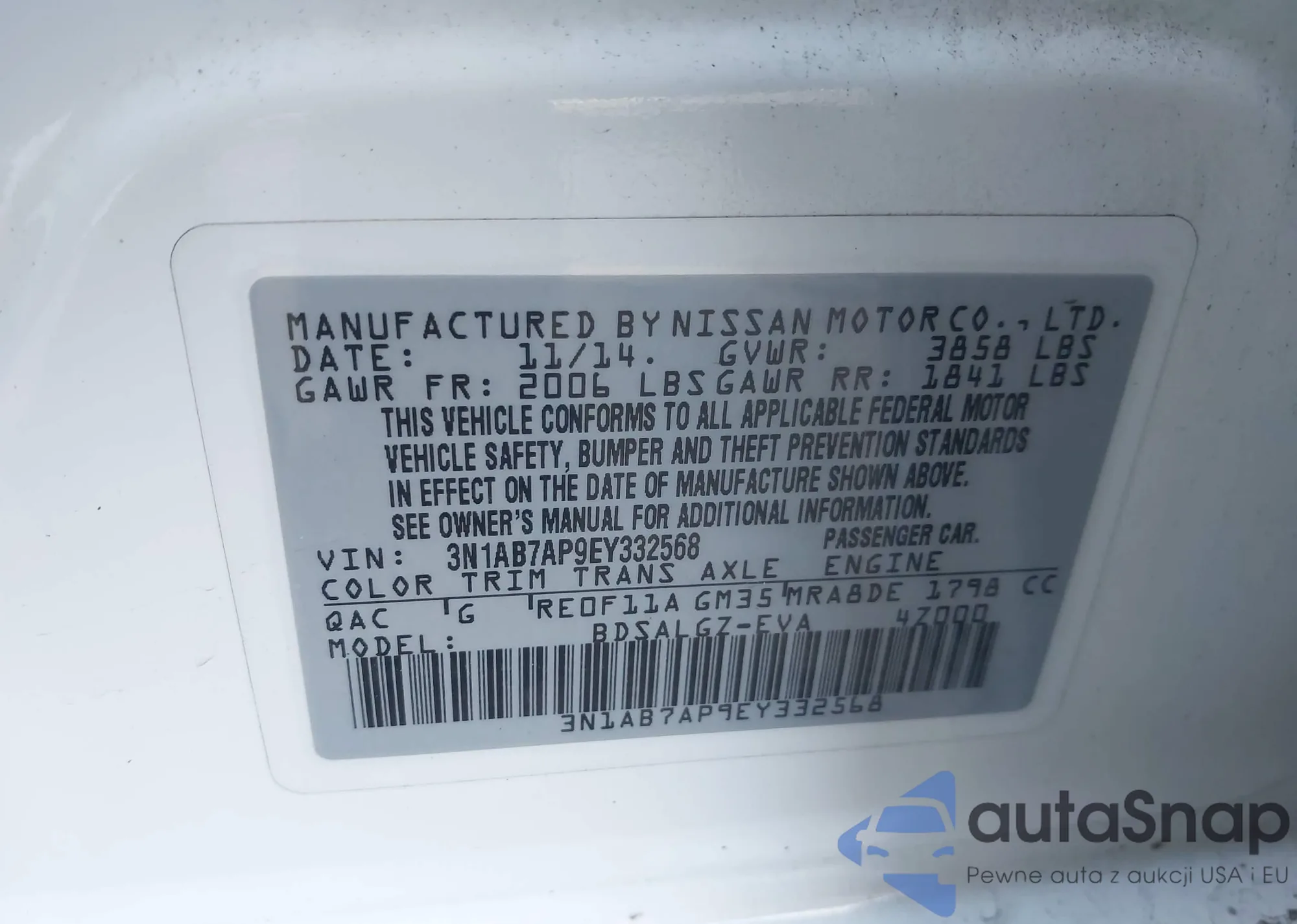 LOT: 43745158 VIN: 3N1AB7AP9EY332568
