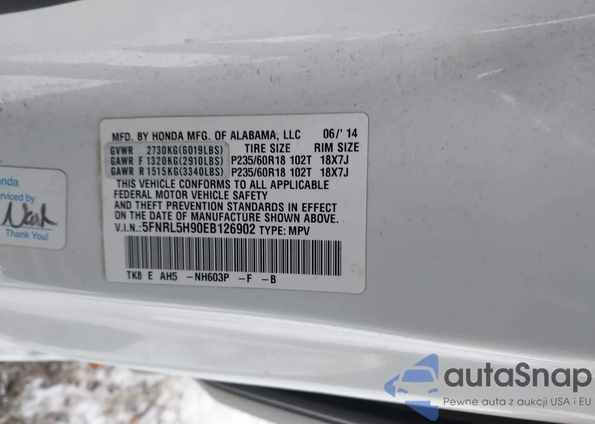 • VIN 5FNRL5H98EB019662