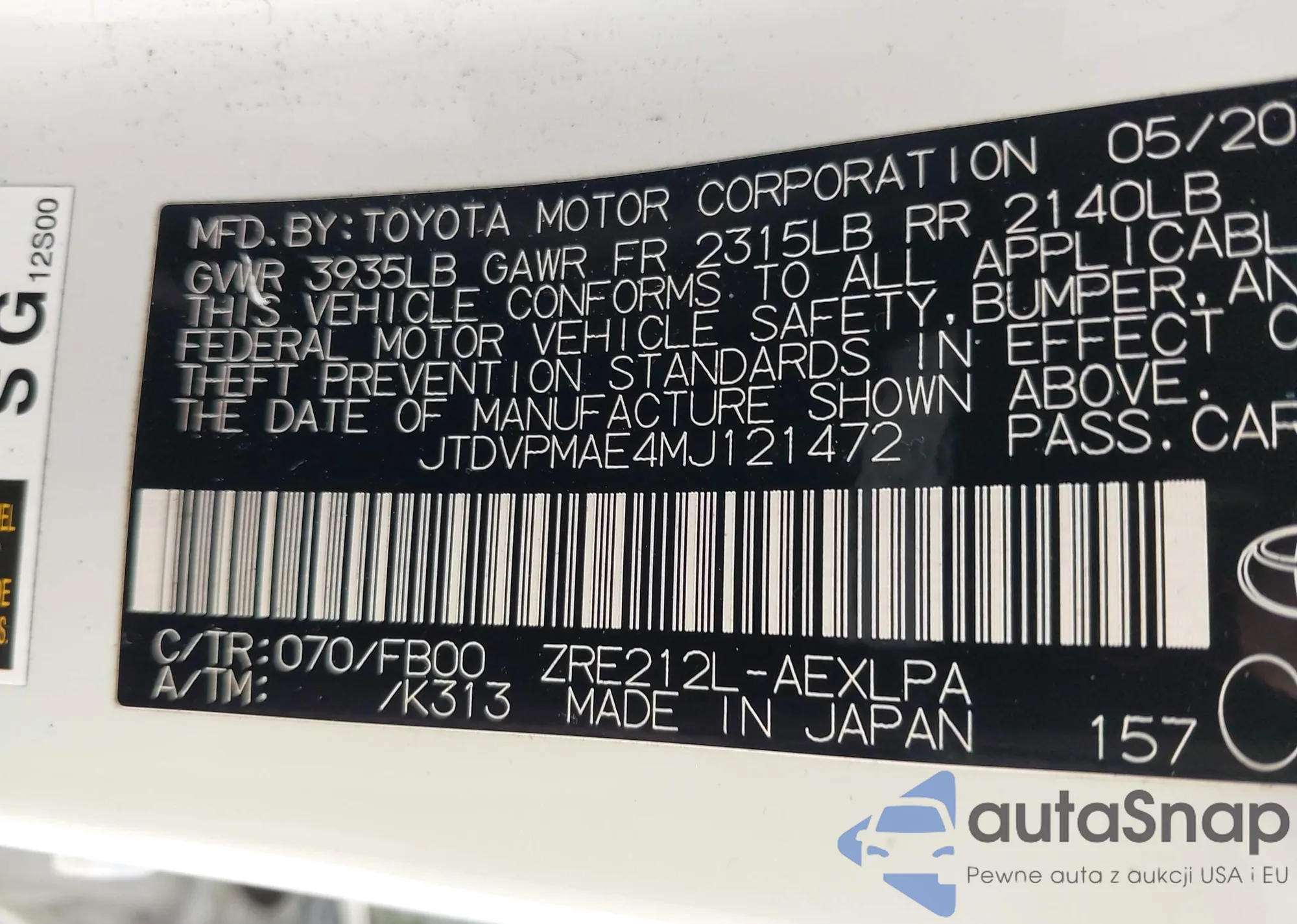 • VIN 4T4BF1FK4CR178319