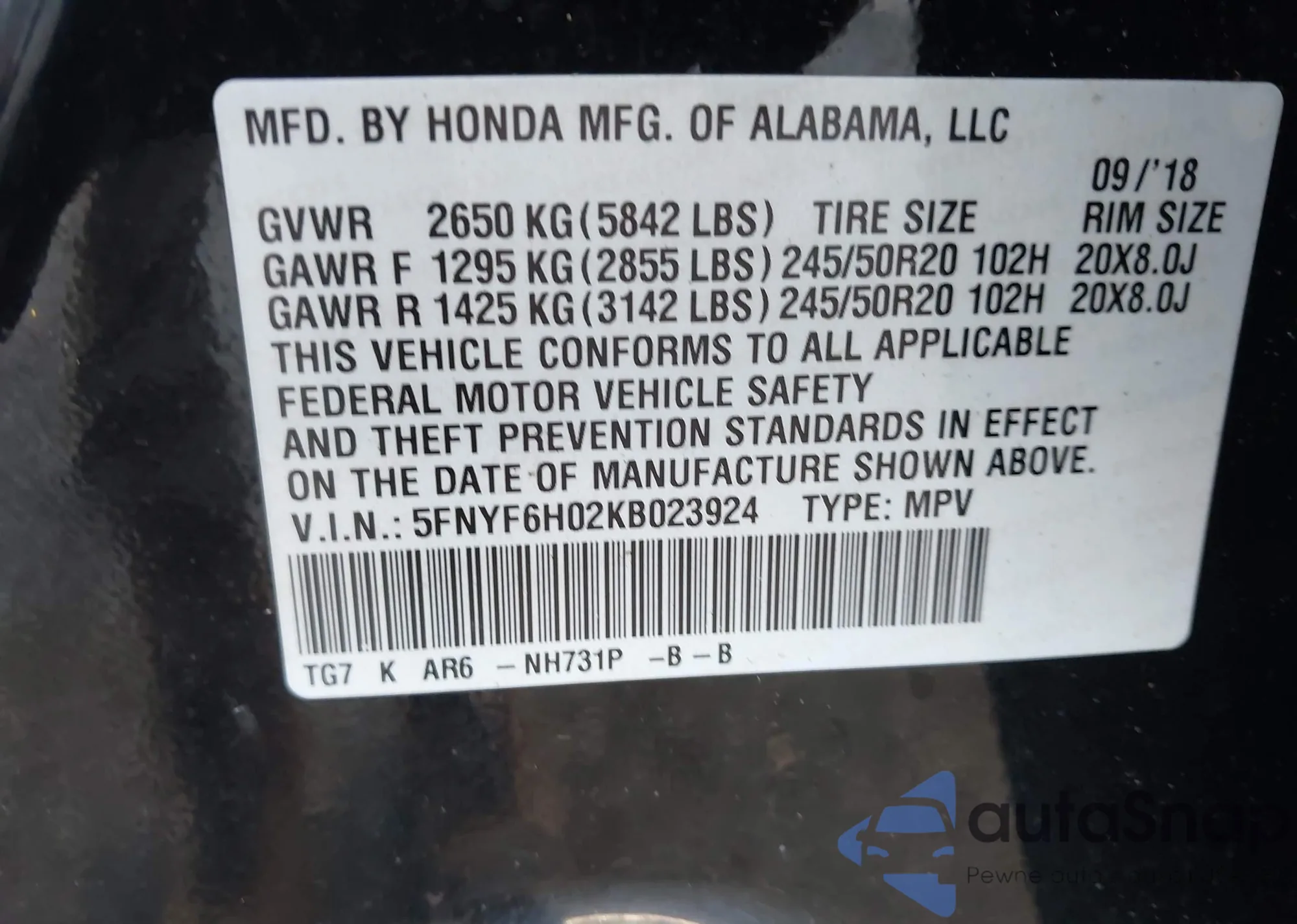 • VIN 5FNYF6H02KB023924