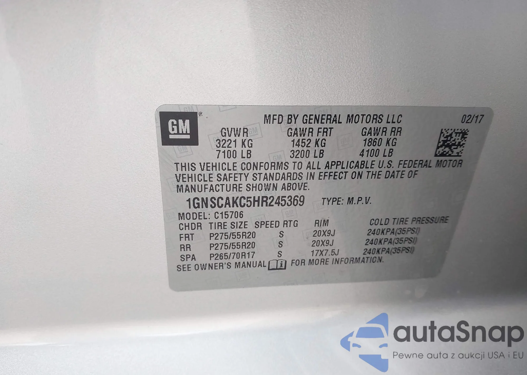 LOT: 44208257 VIN: 1GNSCAKC5HR245369