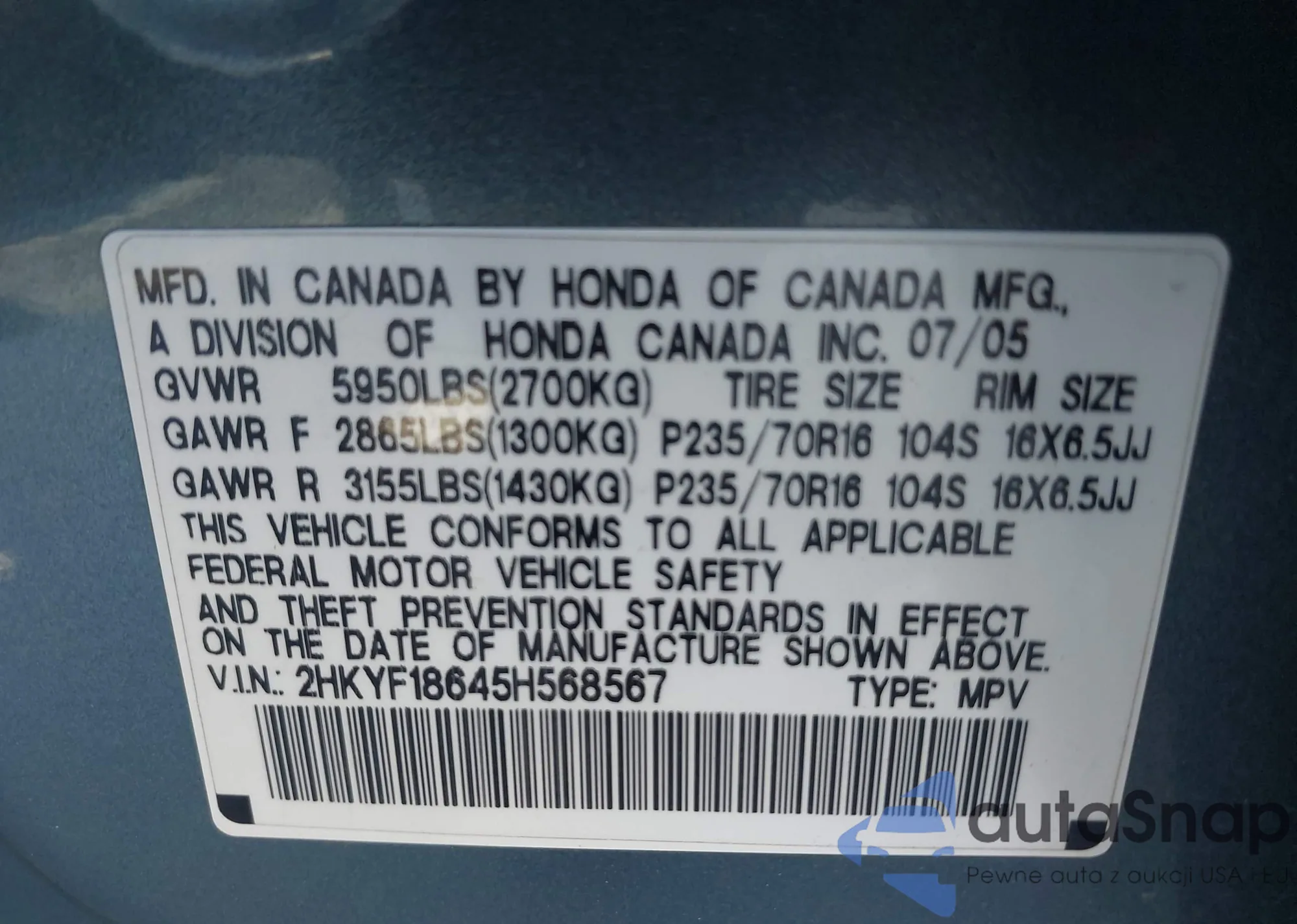 • VIN 2HKYF18645H568567