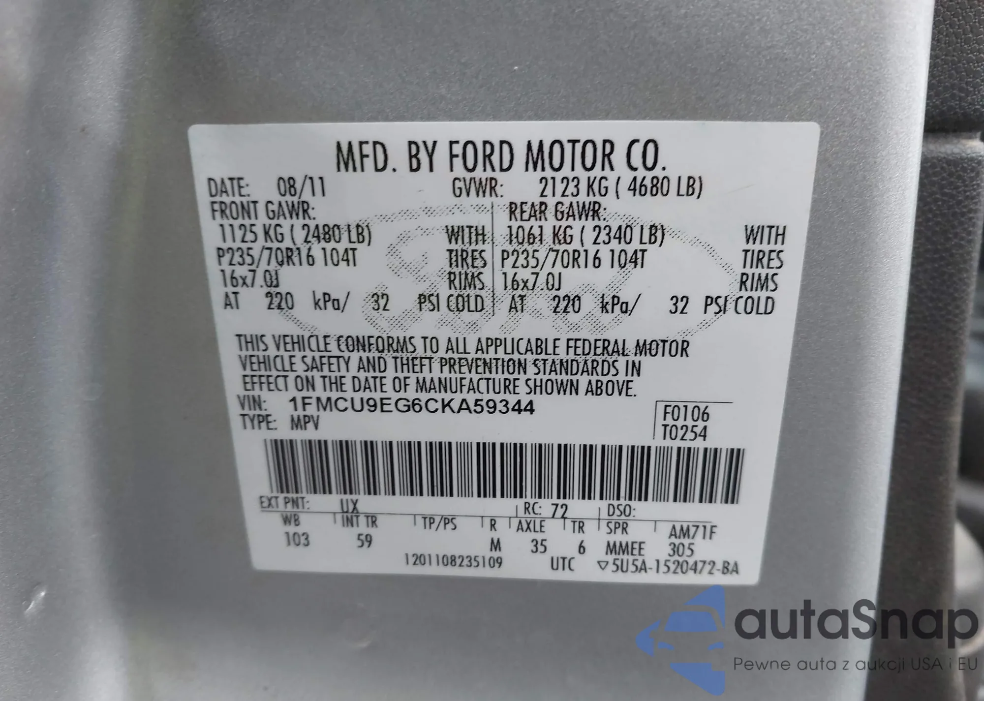 • VIN 1FMCU9EG6CKA59344