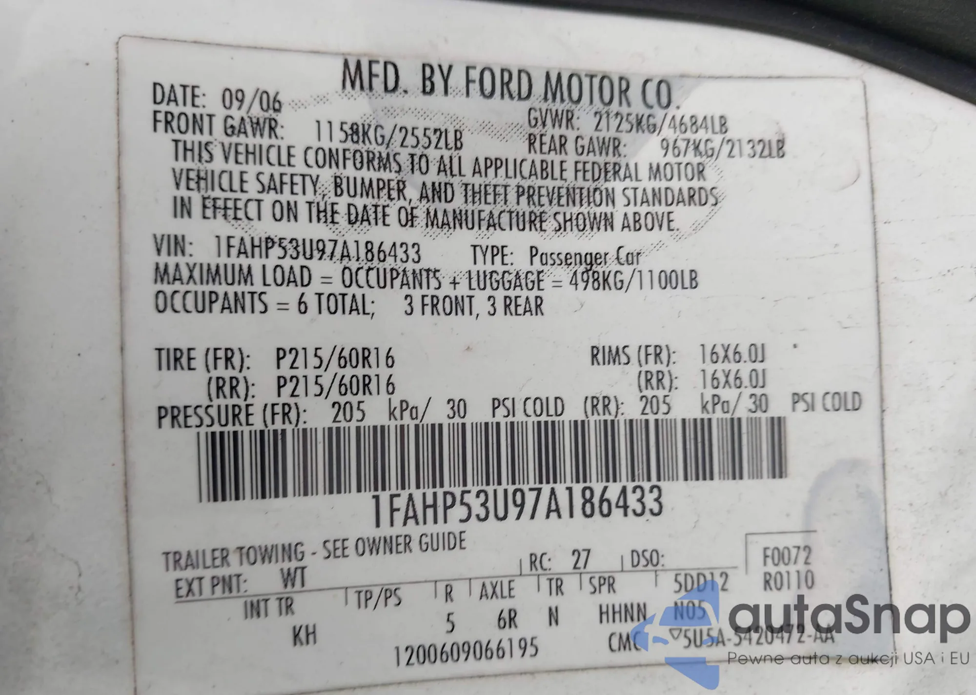 • VIN 1FAHP53U97A186433